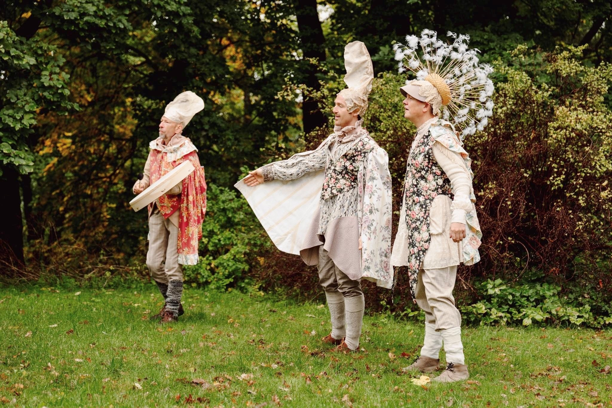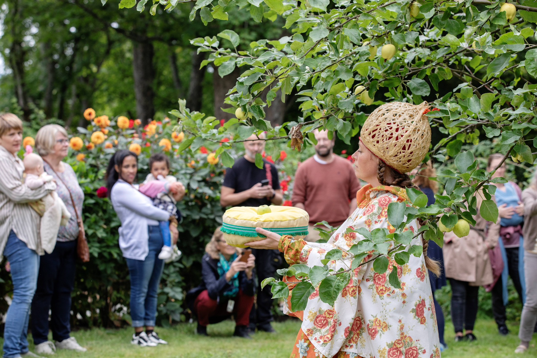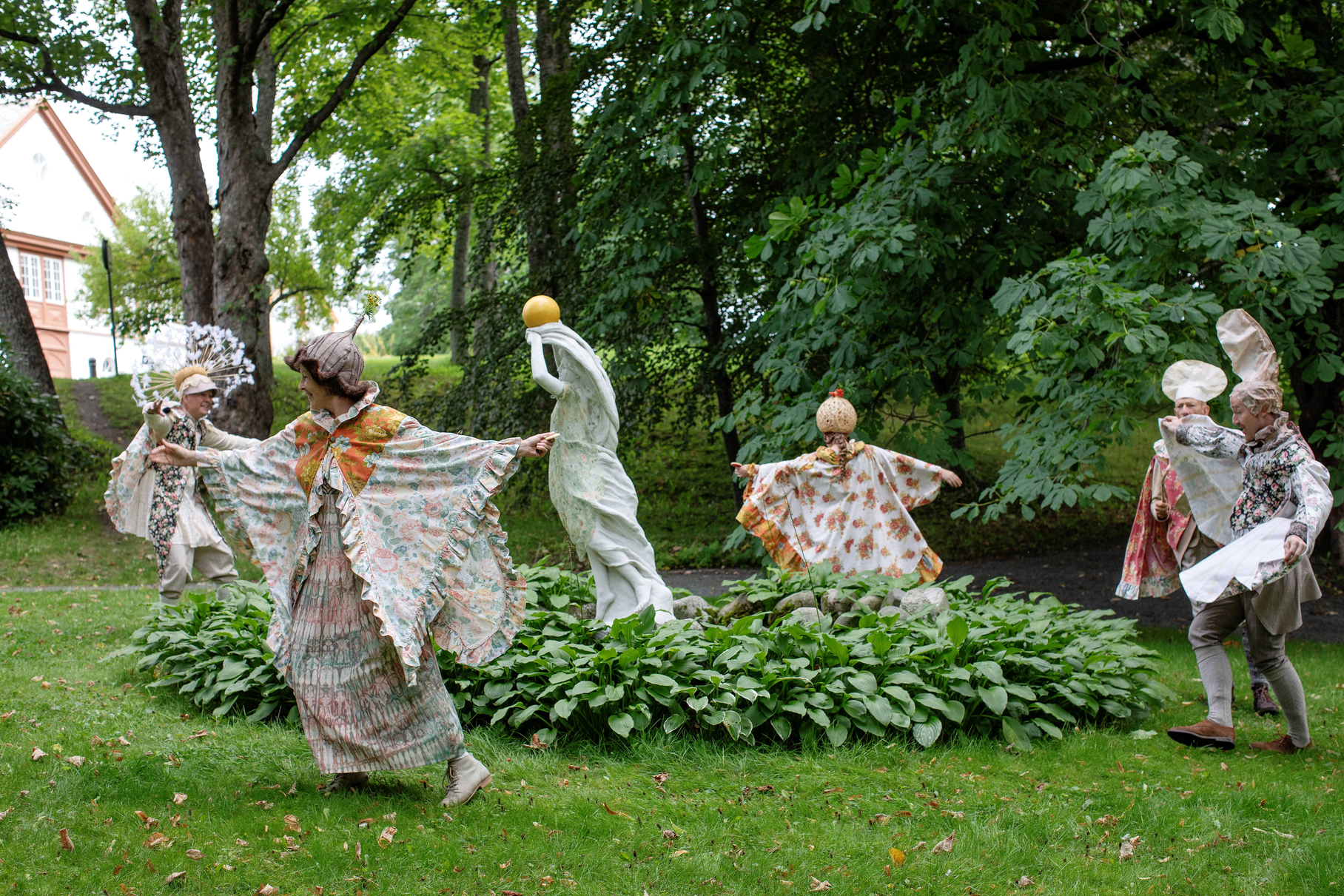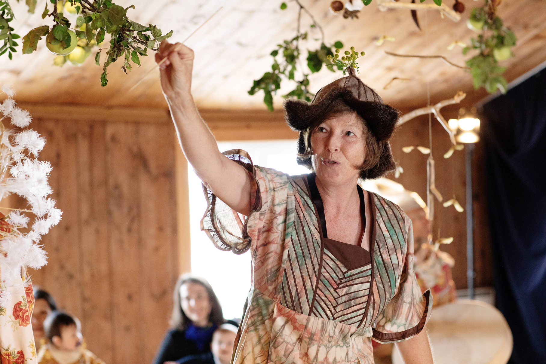 Summer Seeds was played late in the summer, on September 1st and 2nd. Up in the largest maple tree in the garden, LønneLars sat and sang until the green foliage trembled. Maple seeds spun down from the gigantic treetop, like small helicopters descending for landing. Inspired by the spinning of the maple seeds, we whirled like summer seeds towards the garden nymph Pomona, the protector of apples, who for the occasion had been given both a light summer dress and a bright yellow sun that she holds up with her hands. We greeted the summer-dressed Pomona with song and dance, before the seeds whirled on up the stairs to the apple tree.