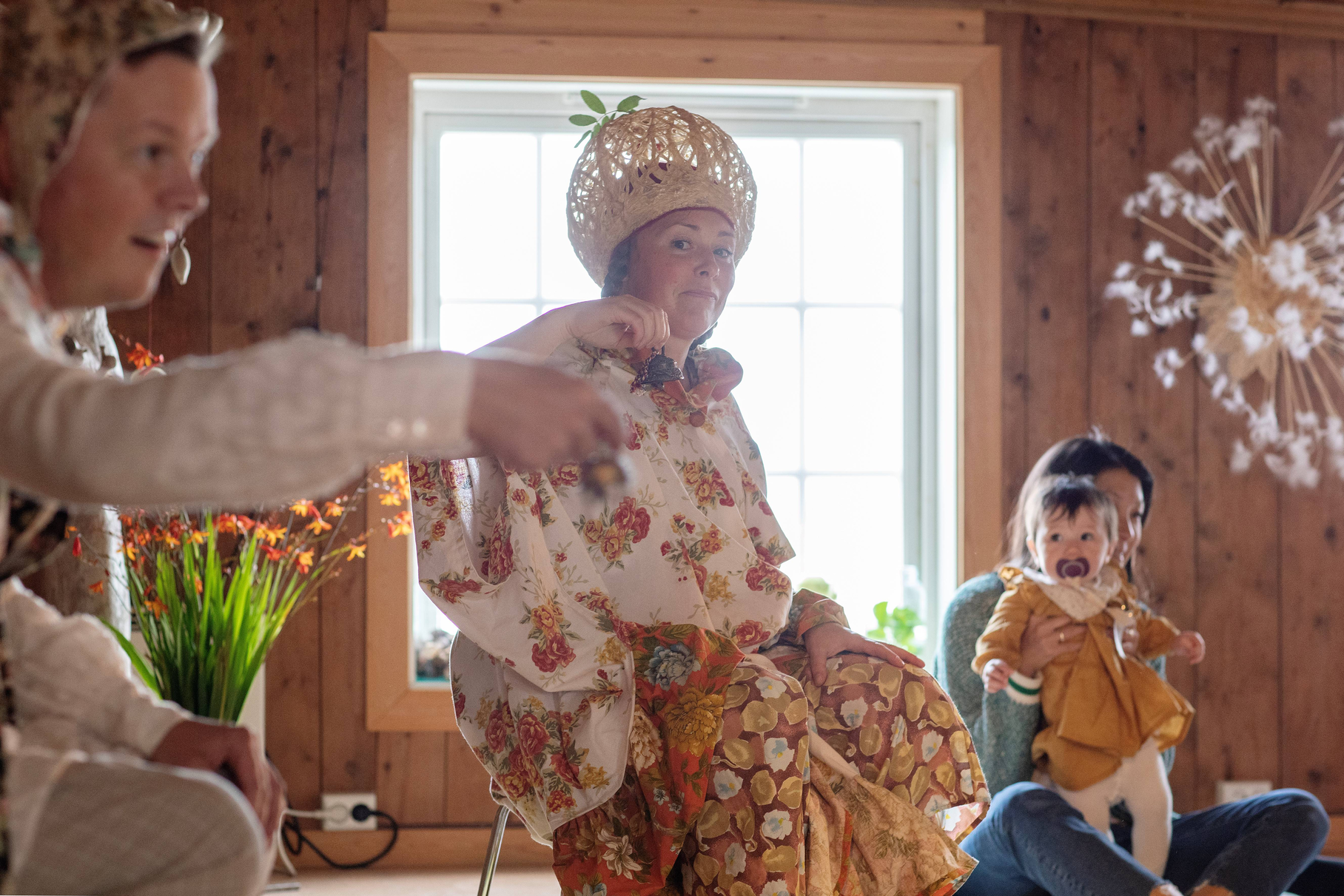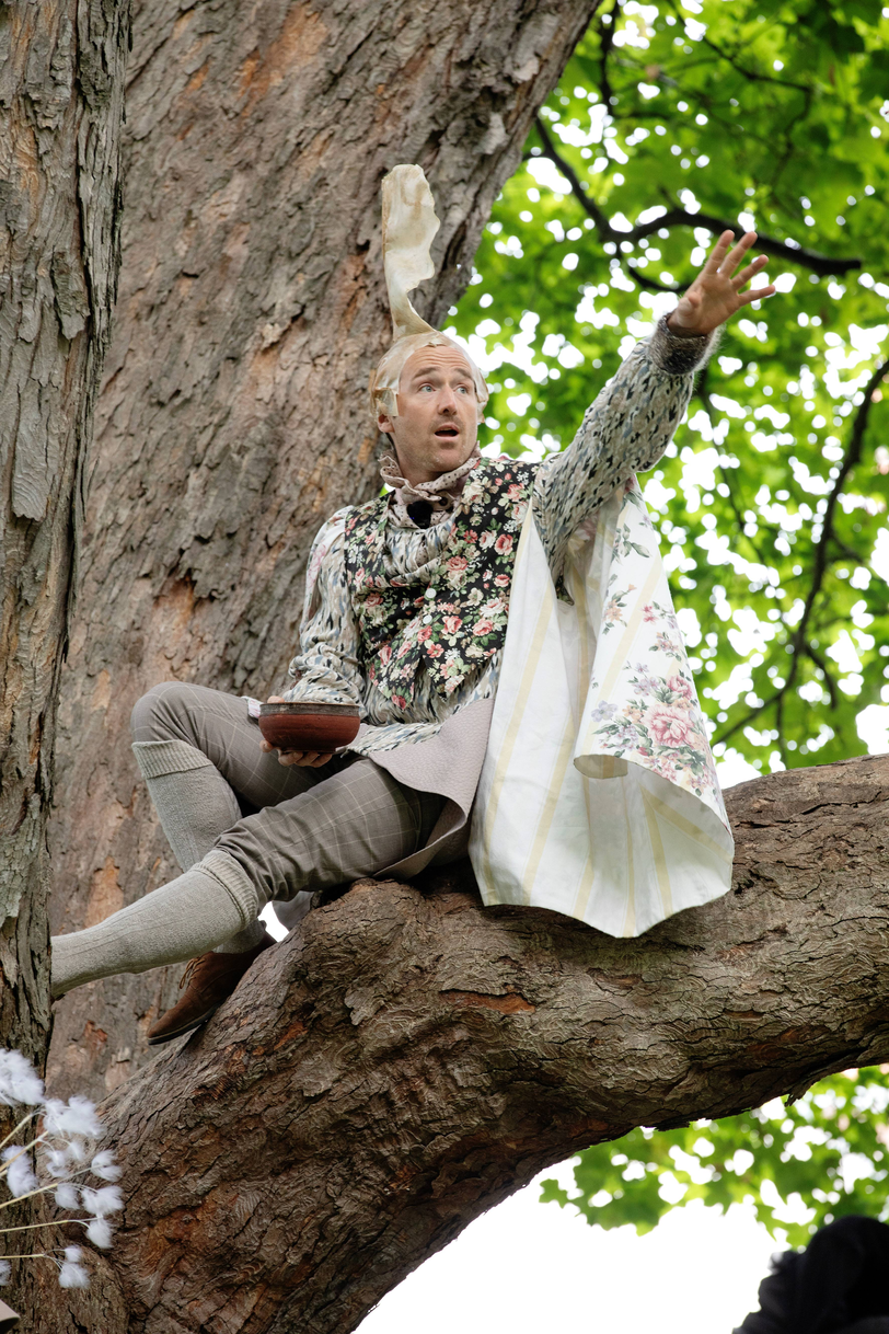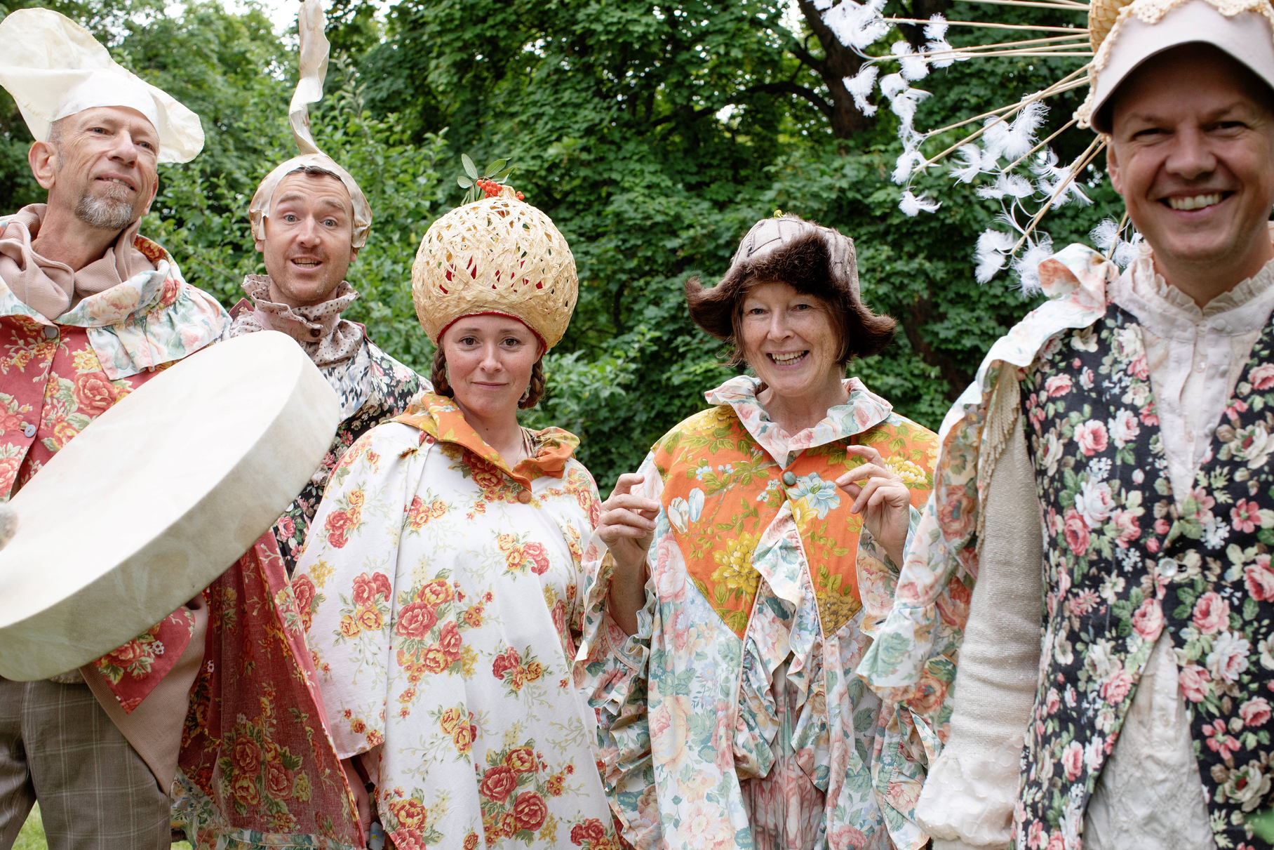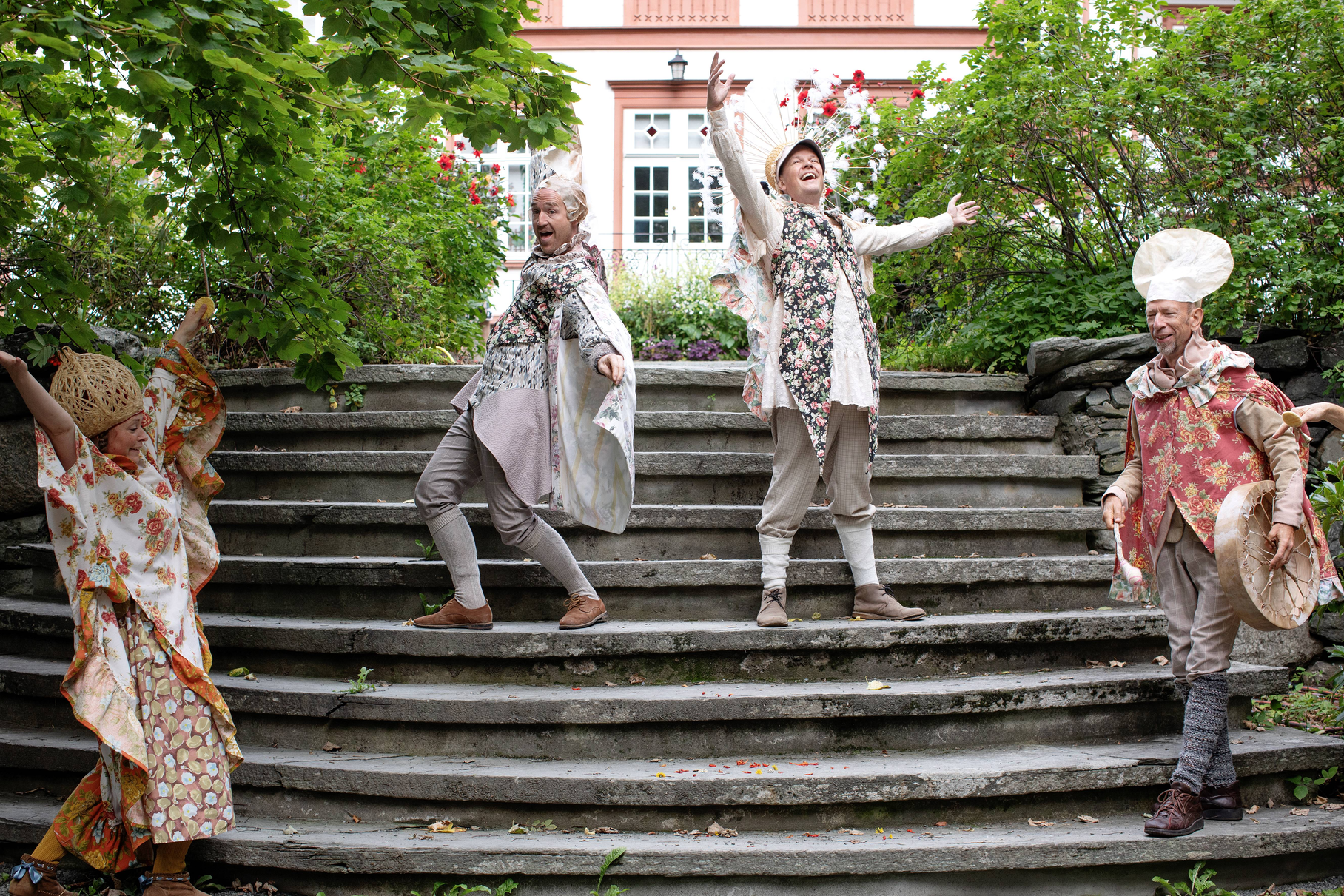 Summer Seeds was played late in the summer, on September 1st and 2nd. Up in the largest maple tree in the garden, LønneLars sat and sang until the green foliage trembled. Maple seeds spun down from the gigantic treetop, like small helicopters descending for landing. Inspired by the spinning of the maple seeds, we whirled like summer seeds towards the garden nymph Pomona, the protector of apples, who for the occasion had been given both a light summer dress and a bright yellow sun that she holds up with her hands. We greeted the summer-dressed Pomona with song and dance, before the seeds whirled on up the stairs to the apple tree.