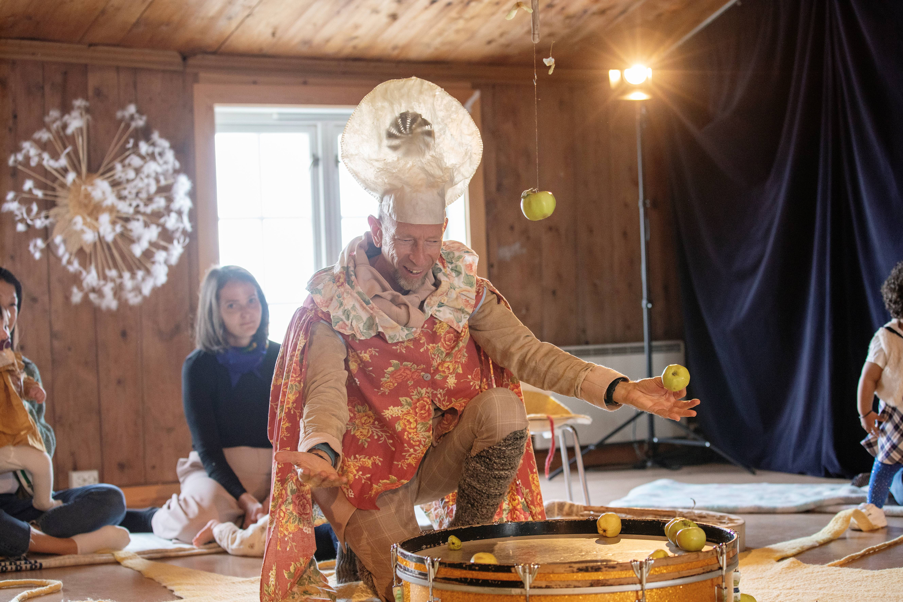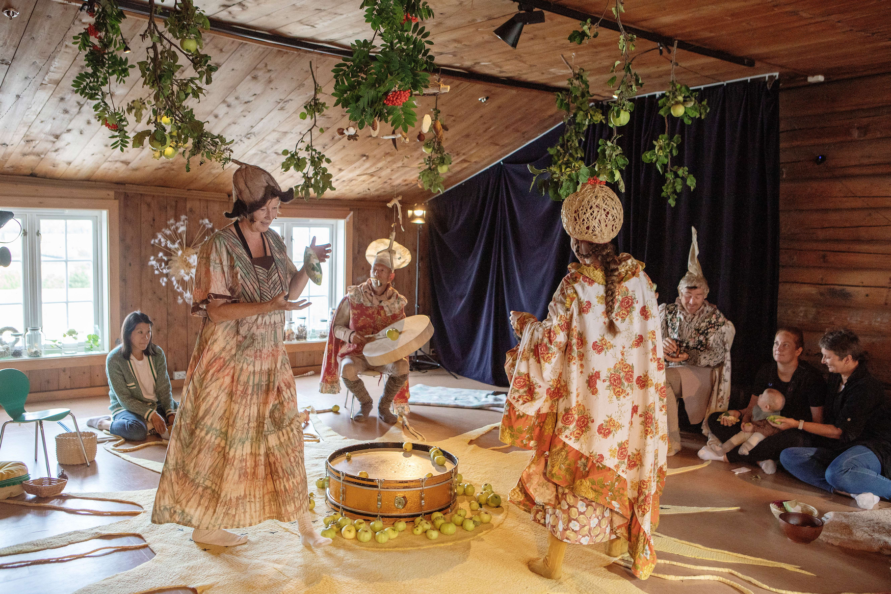 The apple tree stood there waiting for us, full of apples, ready to bestow its gifts on us, which we could carry with us inside. Inside, apples abounded and there was a joyful apple festival with sniffing, crunching and rolling rhythms on the drum.