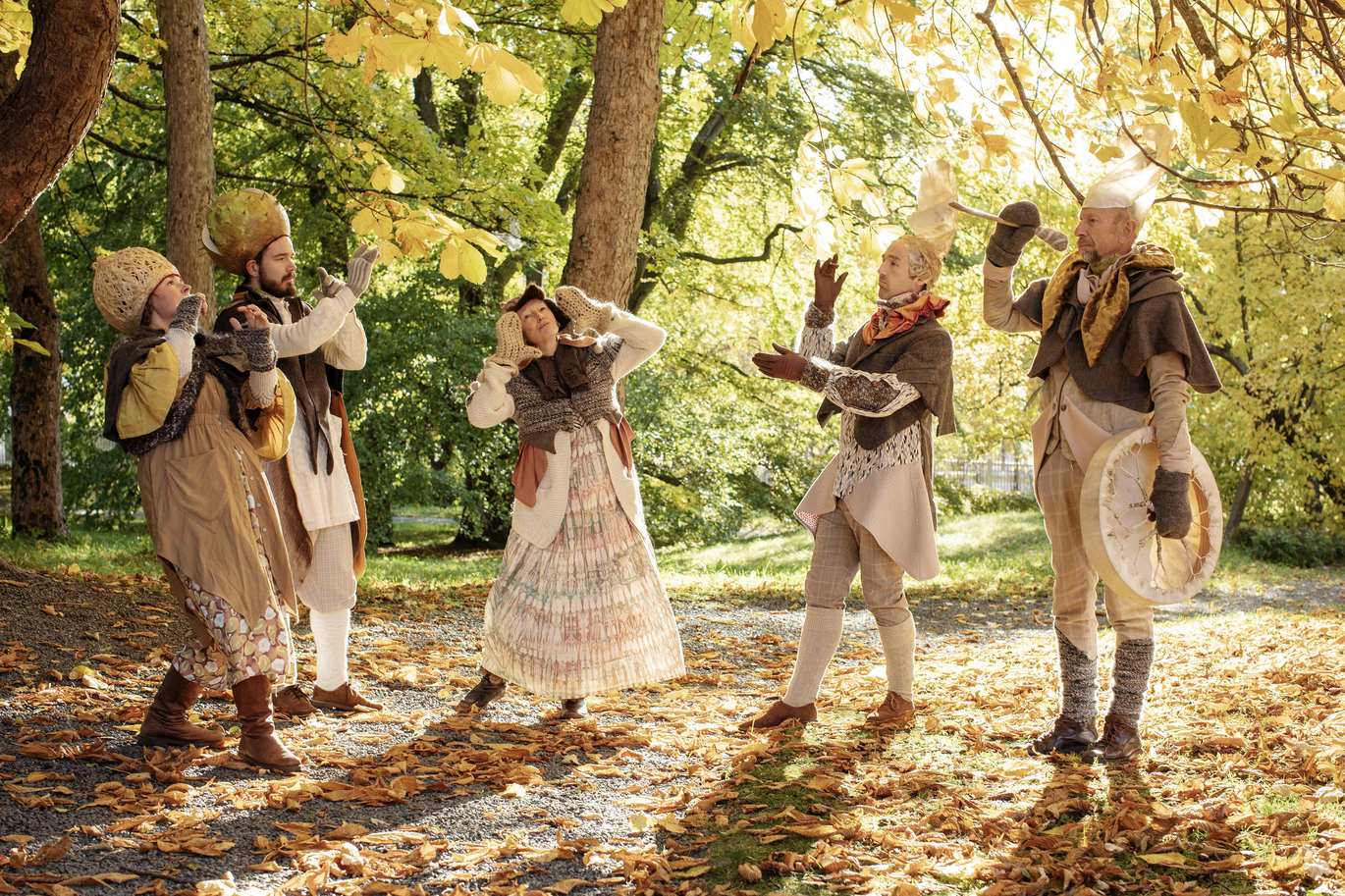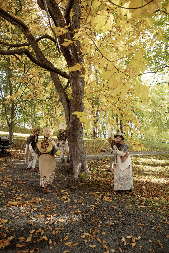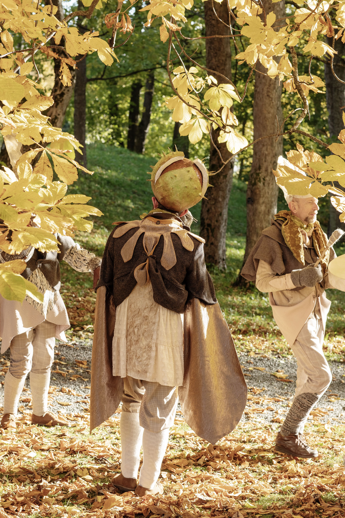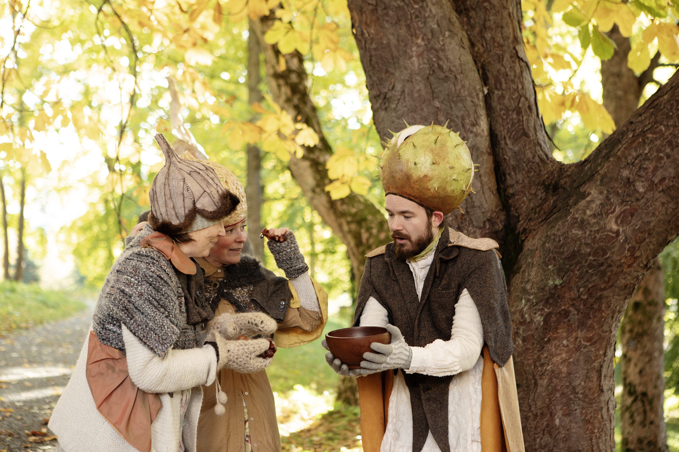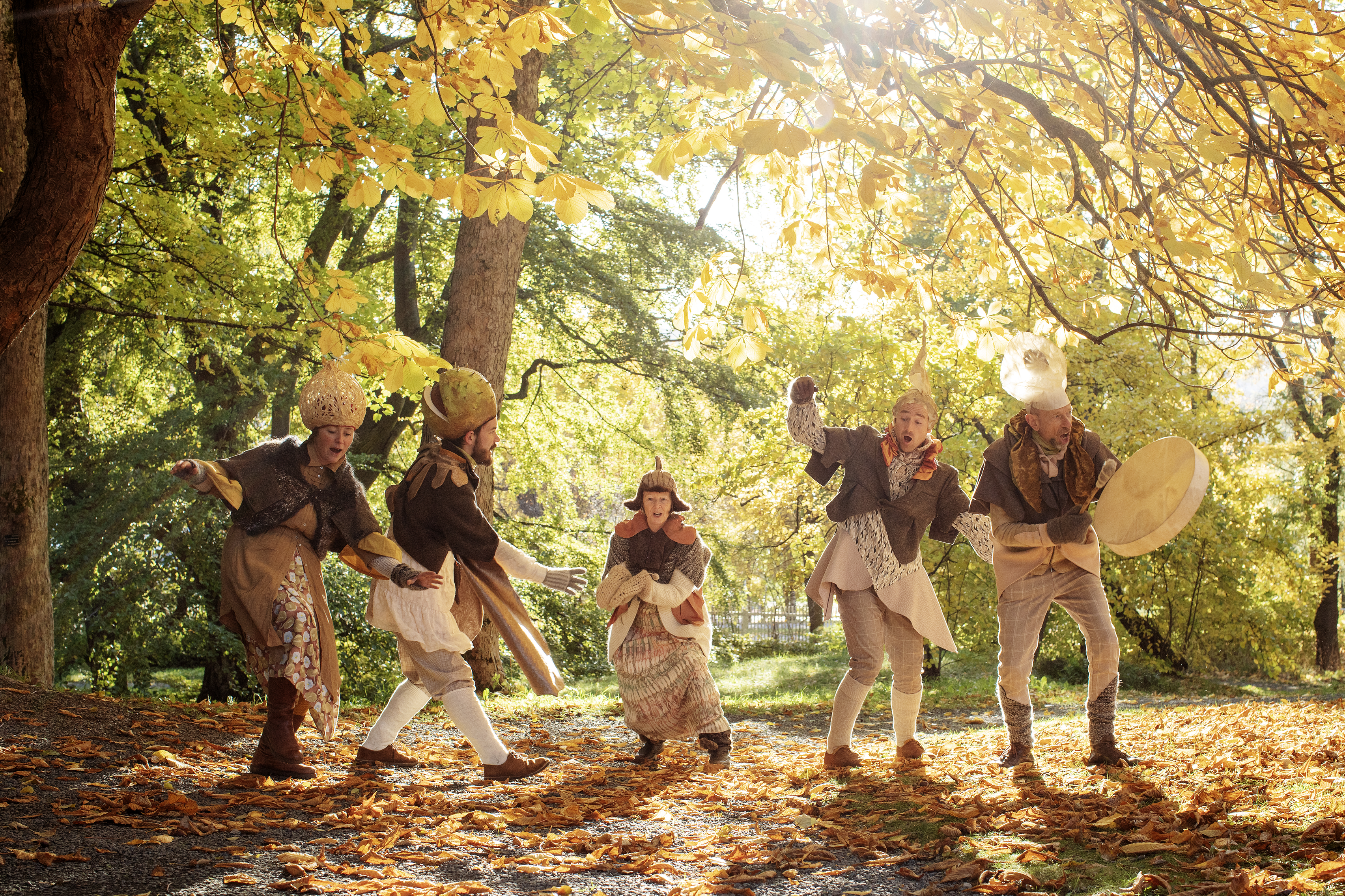 Autumn Seeds. On October 21st and 22nd, we gathered around the bright yellow chestnut tree to say goodbye to summer and sing the last part of the Opera Seeds project. The leaves are falling, and the chestnuts fall with a dull sound to the ground. Seeds sink into the soil to rest. We gathered leaves, chestnuts and other wonderful autumn seeds, then lit a fire that we carried with us into the seasonal room, where glowing autumn leaves hung from the ceiling around the wheel of the seasons, and the drum was full of chestnuts.