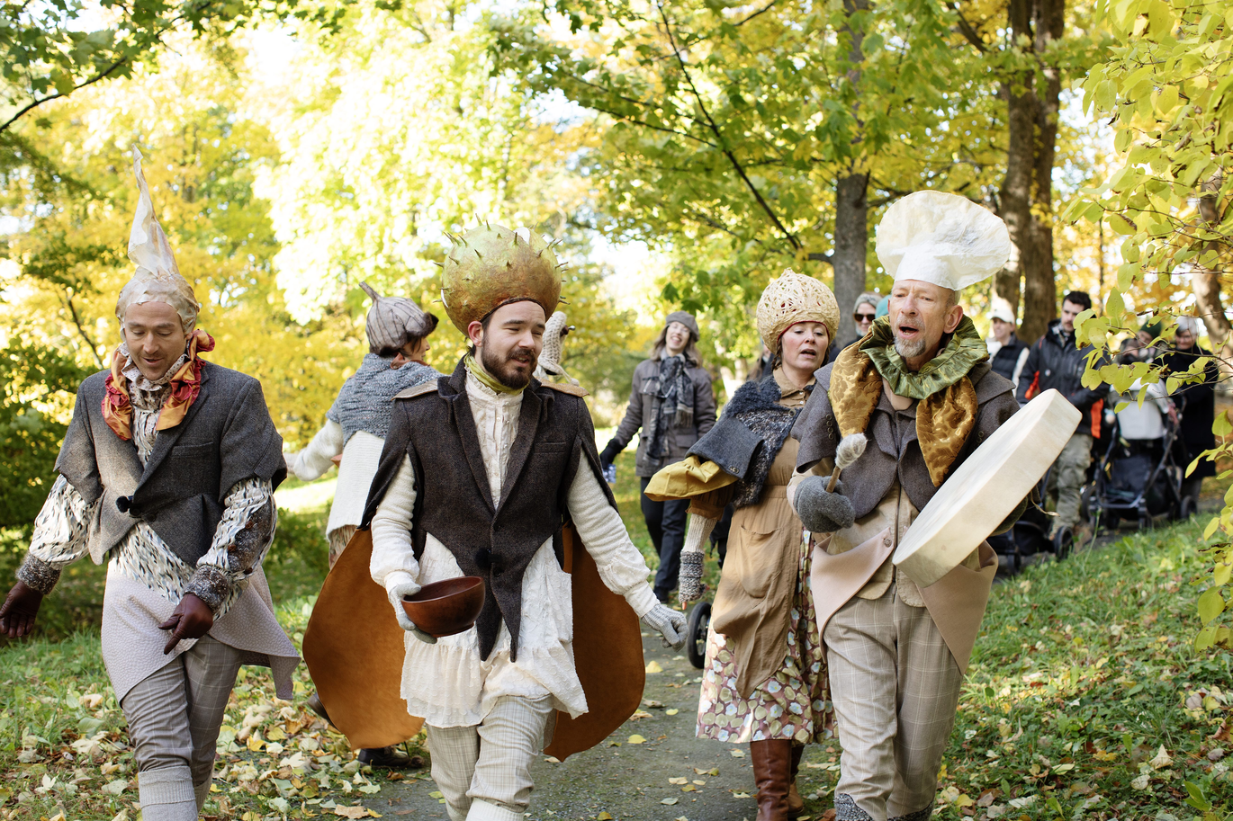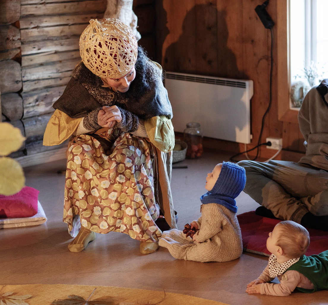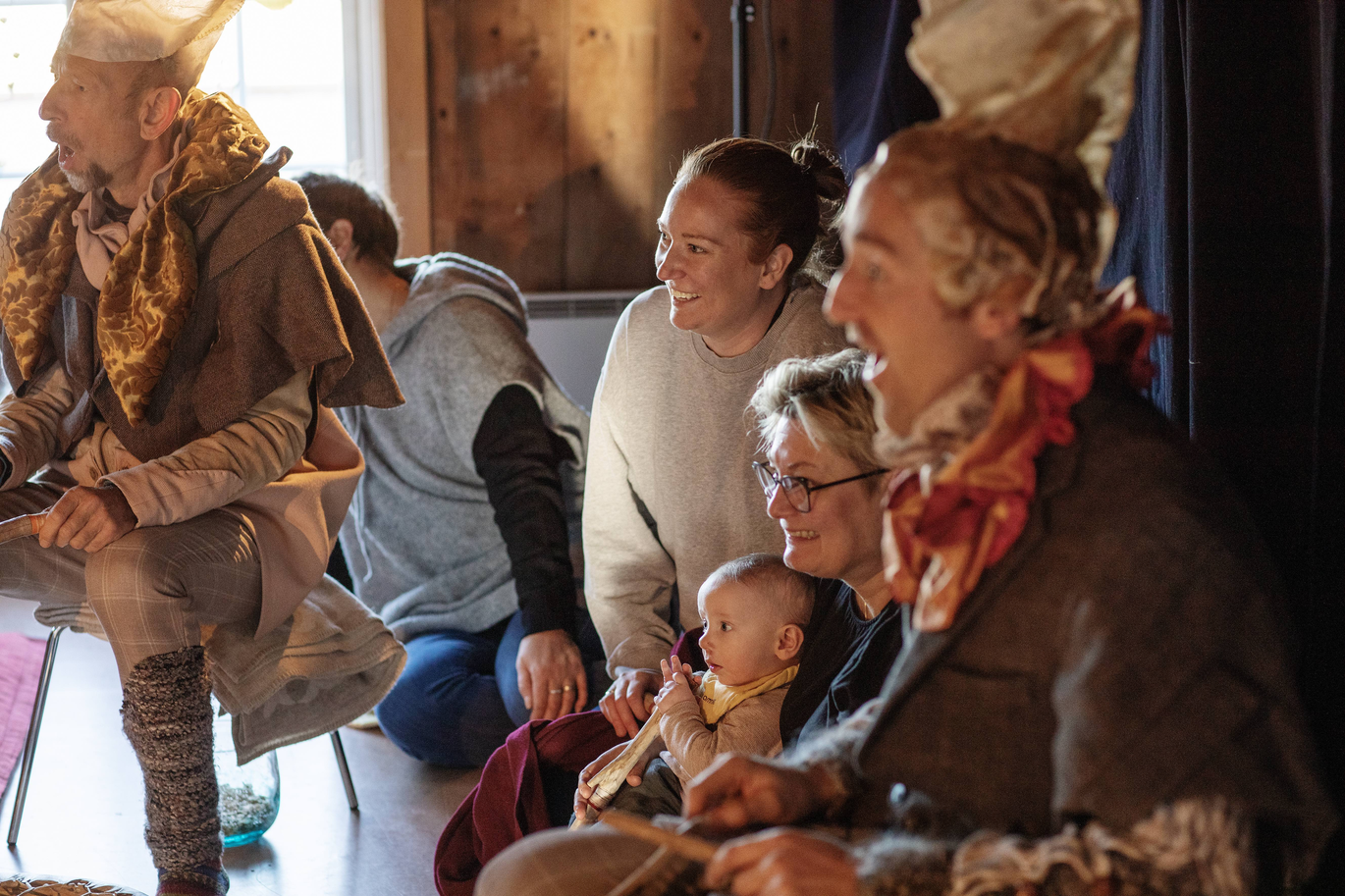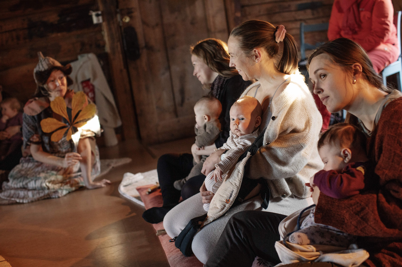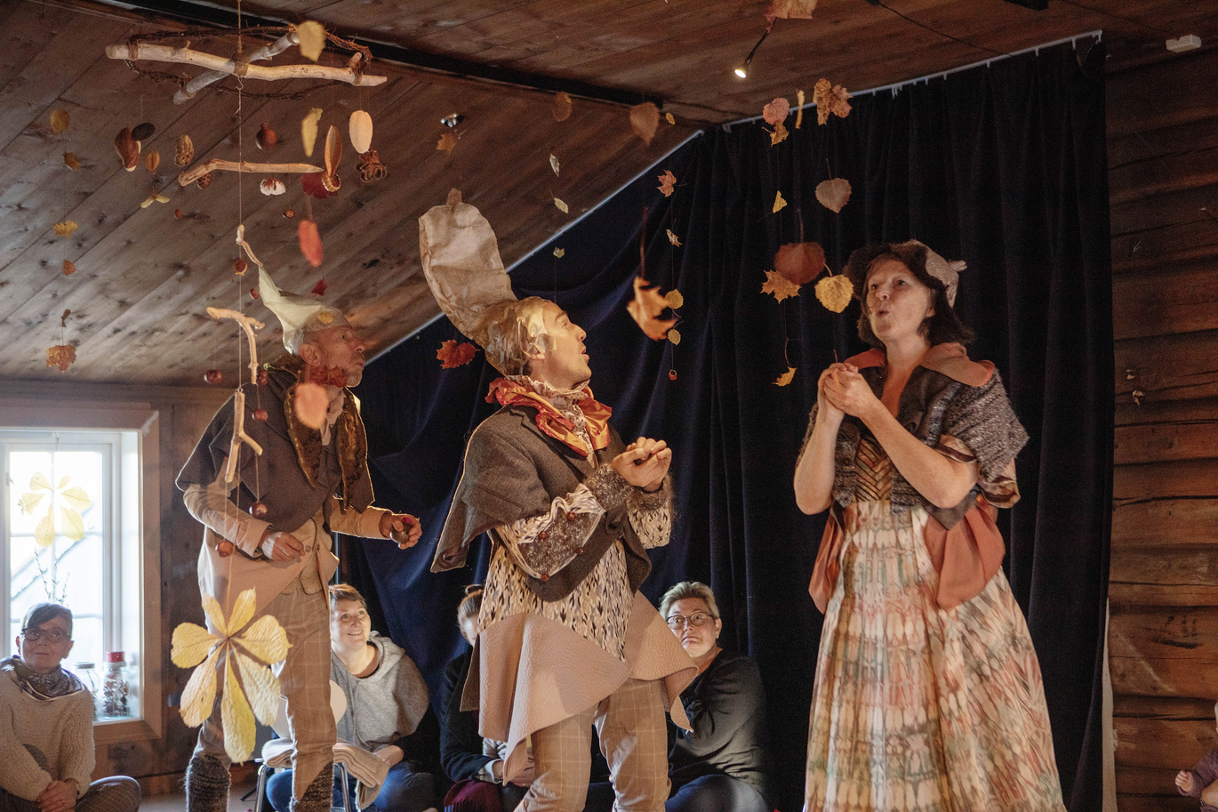 For all the performances, costume designer With had made fantastic seed hats; beech hat, elm hat, maple hat, dandelion and physalis, and for Autumn Seeds the most beautiful chestnut hat, which turned out to hold a playful chestnut prince! So then there was both a chestnut dance, a stick concert and finally a soothing lullaby while all the seeds that had been on the seasonal journey were laid to rest on the drum. Miss Seed finally came with a little frost and lay down protectively over the sleeping seeds, but we carefully sneaked out. Then all we have to do is wait for Winter, and the wheel keeps spinning!