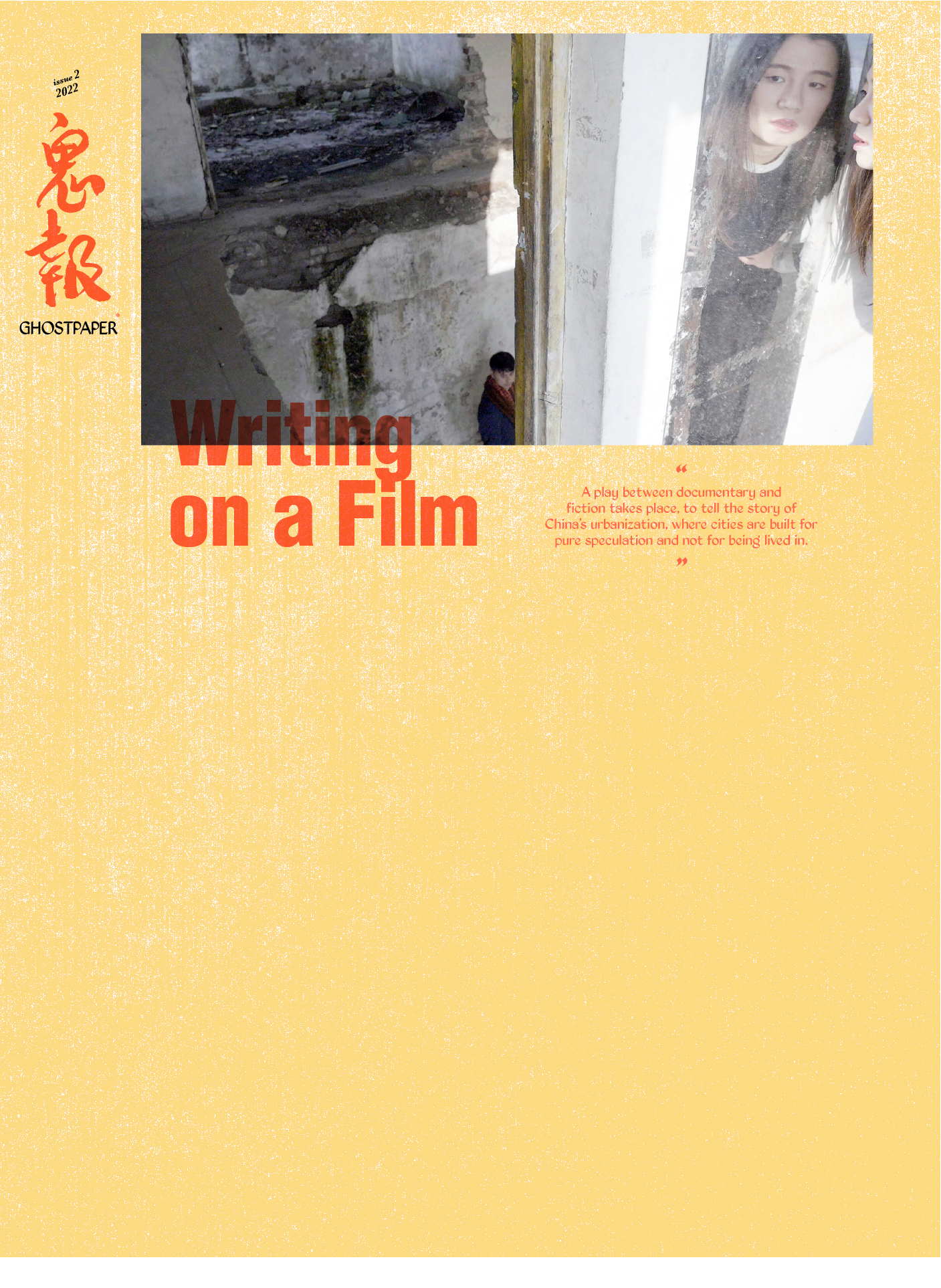 The narrative of this film combines acting and re-enactments in between the real and the fictional to show the social spectacle in a reflexive mode. Protagonists perform as fictitious characters and narrate as a poetic device. This is relevant as reality is more than ever created through image culture, and politics of fantasy. Interviews are conducted and arranged, not for their value as direct quotations but for augmenting the performative acts. In the format of a Chinese ghost story, the protagonists appear ghost-like, but the true ghost is capitalism itself in the perverted form of empty cities. The aim is to create a ‘wandering viewpoint’, which triggers thought more than fact does. The characters are all involved in the real estate market as construction workers, agents, investors, and architects or in advertising. Their roles are created and scripted by real life and performed by actors in an attempt to reflect the working conditions within the global economy.