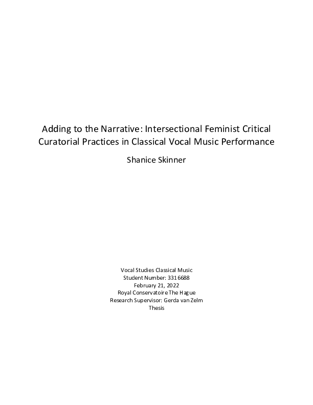 I have examined the issue of neglected women of colour composers in classical music from an interdisciplinary standpoint, utilizing the methodologies of history and experimentation to form an “intersectional feminist critical curation” framework. This framework implements knowledge from intersectional feminist theory and music curation practices in order to answer following questions: “What is the impact on new audiences of diverse backgrounds experiencing classical music through an intersectional feminist curatorial framework?”, "Can classical music be an effective device for messages of social and political change?", and “What is the impact on myself as a classical vocalist and a Black woman to implement an intersectional feminist curatorial framework within my musical study and performance?”. The overall goal of this research was to discover an effective way forward to achieving diversity in classical music for underrepresented groups. Drawing from this study, I have created a digital performance project entitled “The Narrativity Sessions,” which functioned as an experiment utilizing this knowledge of intersectional feminist theory and praxis fused with select critical curation strategies applied to my own artistic practice as a classical singer. The outcome was a novel artistic practice that can contribute to creating innovative and artistically fulfilling performances while simultaneously advancing diversity and inclusion in the classical music sphere for audiences, performers, and composers alike.