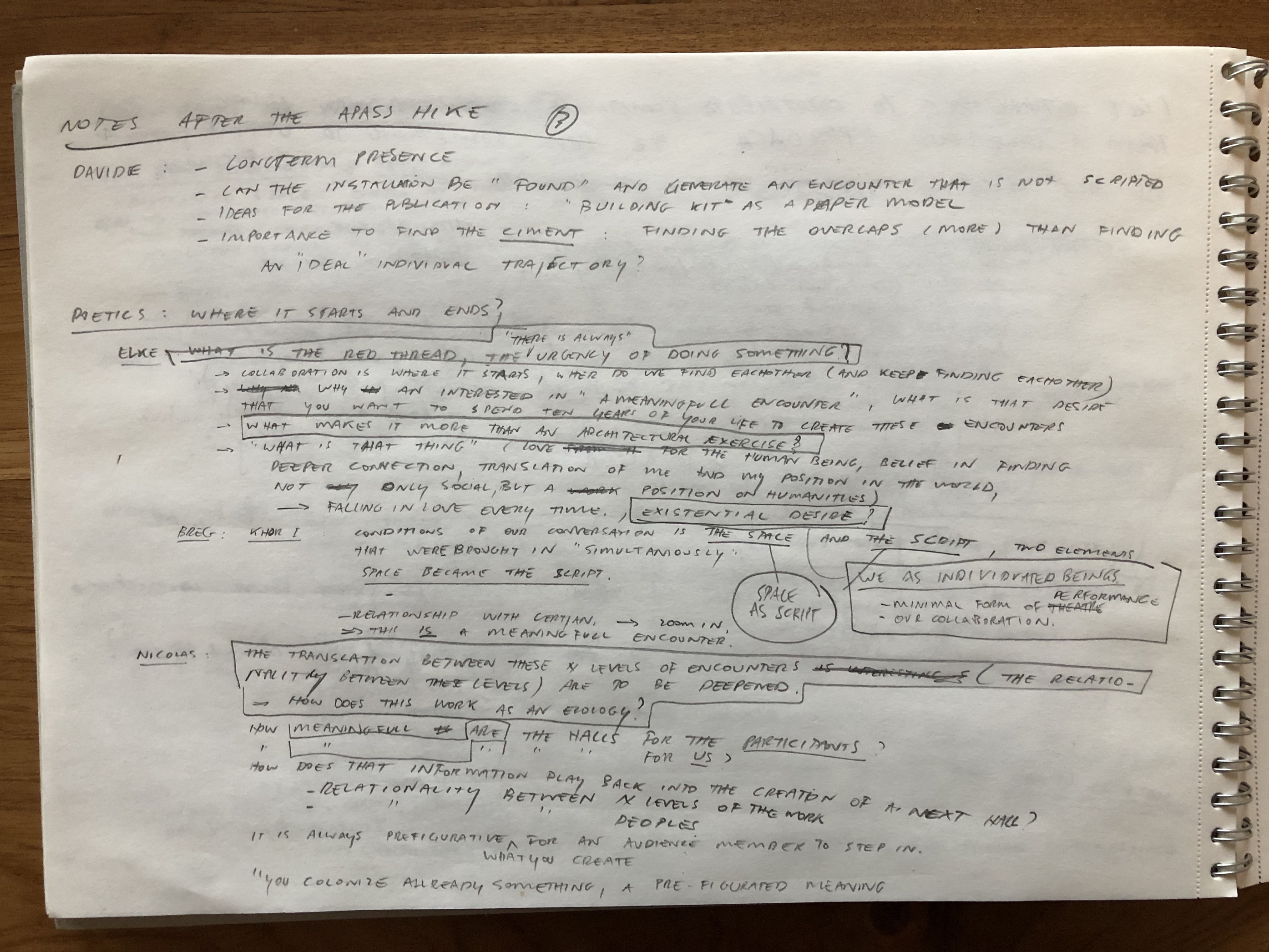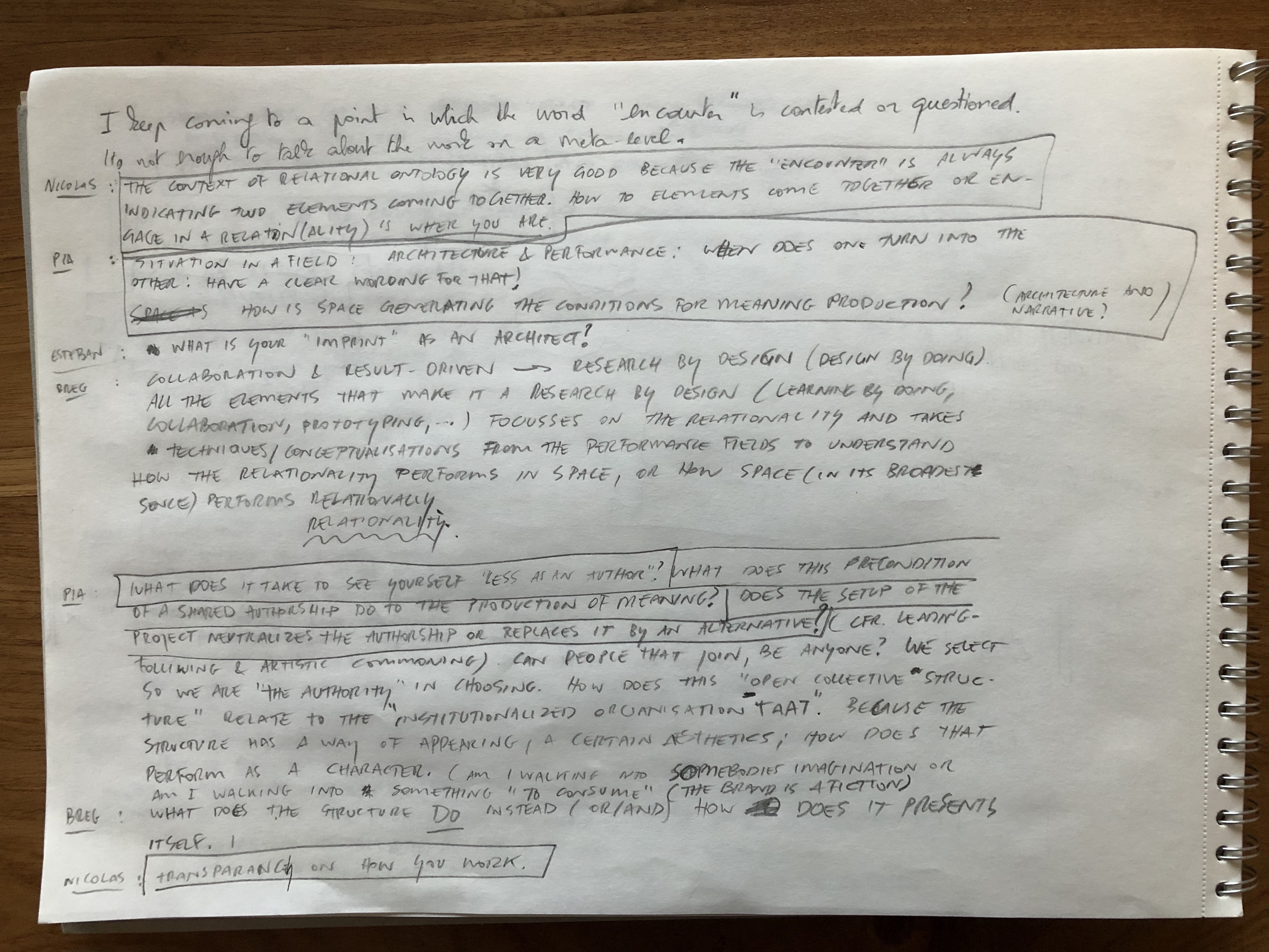 The encounter between Gert-Jan and I, generated a third thing, a question with a spatial answer. Can we make a building that is a theatre play? Yes, let's call it HALL33. This third thing (a material thing in Rancieres sense) lay the footprint for a longterm project, materially and immertially, building (a) relationship(s). The desire and the poetics is outside of me, but in between us. This moment was fundamental in the formulation of the core values in which our practice developed, shared authorpship, transdisciplinarity and open source development.