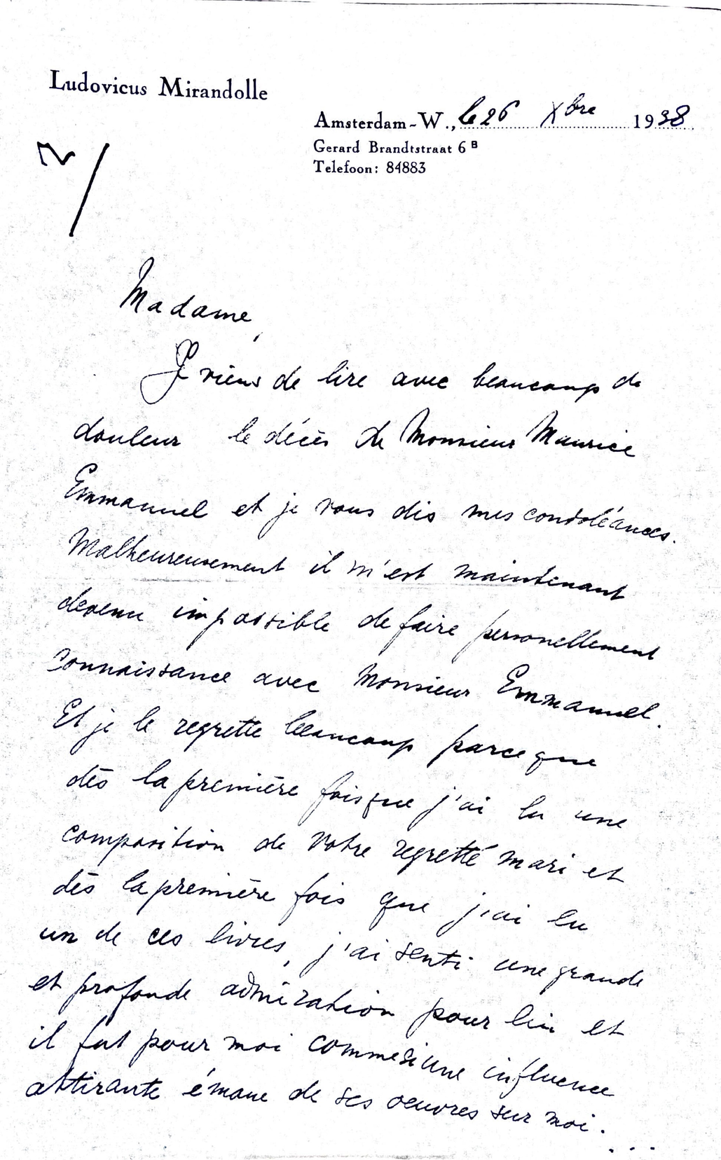 Thirdly and finally, we have letters from the personal archive of the family Maurice Emmanuel, provided by the granddaughter of Maurice Emmanuel, Anne Eichner-Emmanuel. Maurice Emmanuel was a composer and musicologist who had Yvonne Lefébure as one of his students. Ludovicus Mirandolle was a great admirer of him and his music, but never got to meet him in person. Ludovicus Mirandolle had a long letter correspondence with the widow Emmanuel, and the children Frank and Helene. In one of the letters, sending his condolences to the wife and daughter of Maurice Emmanuel, he mentiones that unfortunately it is impossible now to meet Maurice Emmanuel in person. Ludovicus Mirandolle felt a great and deep admiration for Maurice Emmanuel and was influenced by his work, "...j'ai senti une grande et profonde admiration pour lui et il fut pour moi comme si une influence attirante émane de ses oeuvres sur moi".20