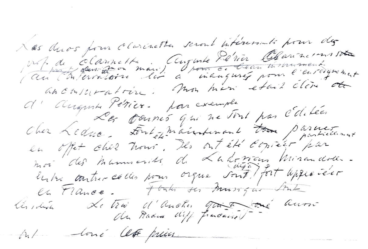 It turned out that these documents did contain a lot of valuable information about the life of Ludovicus Mirandolle. One document shows a sketch for a letter by Annie Mirandolle-Sleeswijk to a Madame in France, probably the widow Koechlin. On the last page of the sketch she writes "Les duos pour clarinettes seront intéressant pour des prof. de clarinette. Auguste Périer clarinettiste (?) au conservatoire les a inauguré pour l'ensignement au conservatoire. Mon mari etait élève d'Auguste Perier."8 Here we find another puzzle piece in the life of Ludovicus Miranondolle. He studied with Auguste Périer (1883-1947), possibly following private lessons at Périers home, as we can not prove that Ludovicus Mirandolle followed lessons at the Conservatoire national supérieur de musique et de danse de Paris, and we have no evidence that Mirandolle received a diploma.