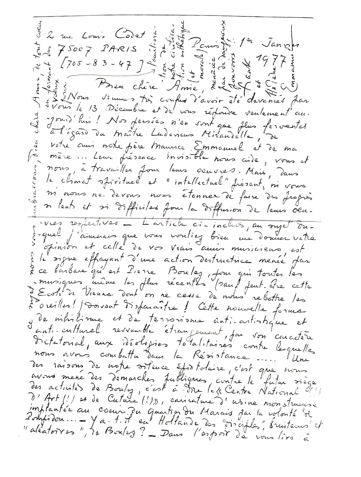 Noteworthy is also the second half of the letter. It gives us an idea how the composers from before the war were struggling with the new developments in the music. They speak about "...une action destructrice menée par ce barbare qui est Pierre Boulez..." , and show a negative attitude toward Boulez, who according to them wants all the music to dissapear, with the (2nd) Viennese school as exception. They even take it a step further and speak of "...terrorisme anti-artistique et anti-culturel ressemble étrangement, par son caractère dictatorial, aux idéologies totalitaires contre lesquelles nous avons combattu dans la Résistance...". It is very clear that the negative attitude towards this new form of music making is very strong, asking if The Netherlands is also struggling with supporters of Boulez.9