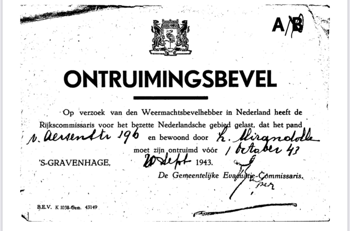In 1943, Ludovicus writes to Yvonne and Freddy that they need to move out of their home at the Van Aerssenstraat because of "...le bureau d'evacuation...".16 In the archive of Corry de Roo-Vierdag we can find back the notice they received.