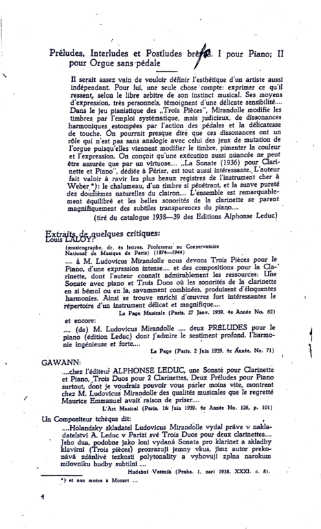 Gawann: "...dont je vourdrais pouvoir vour parler moins vite, montrent chez M. Ludovicus Mirandolle des qualités musicales que le regretté Maurice Emmanuel avait raison de priser" (La Page Paris, 2 Juin 1939, 4e Année No. 126. p. 101)