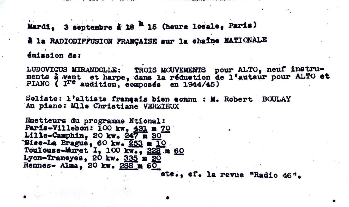 “Sonate en Trio…10-III-1943…Radiodiffusion Nationale, Paris…”