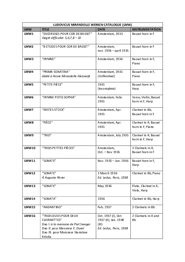 The first work in 1933 called Excersises pour cor de basset (LMW1) he did not mention in his notebook, but this we had to find out in the sheetmusic itself. The Exercises for basset horn are not orginally by Ludovicus Mirandolle, but are other already existing exercises that he made transcriptions of for basset horn. I still see this as one of his works, showing Mirandolle’s interest in the basset horn.