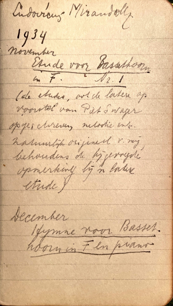 “1934 November, Etude voor Bassethoorn in F. Nr 1 (de etudes, ook de latere op voorstel van Piet Swager opgeschreven, melodie enz. natuurlijk origineel v. mij, behoudens de bijgevoegde opmerking bij in latere etude)”7