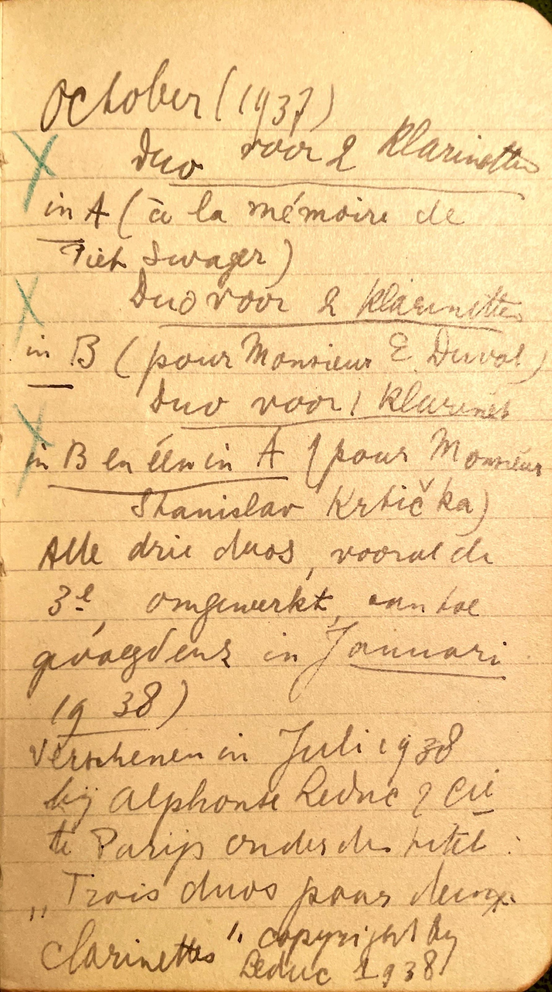 Ludovicus Mirandolle starts composing for simple and small instrumentations. The first work that he mentions in these notebooks is 8 etudes pour cor de basset (LMW2) composed in 1934. About this piece he writes in his notebook: “1934 November, Etude voor Bassethoorn in F. Nr 1 (de etudes, ook de latere op voorstel van Piet Swager opgeschreven, melodie enz. natuurlijk origineel v. mij, behoudens de bijgevoegde opmerking bij in latere etude)”1. We can read here that Mirandolle starts writing etudes for the Basset horn because Piet Swager proposed this idea to him. Piet Swager (1878-1936) was the second clarinettist of the Concertgebouw Orchestra and was one of the many clarinettist that Ludovicus Mirandolle had contact with. Piet Swager must have been an important person in the life of Ludovicus Mirandolle. In Trois Duos (LMW16) published by Éditions Musicales ALPHONSE LEDUC in 1938, we can see that the first movement has the text “à la mémoire de Piet Swager”2. The first movement of Trois Duos was dedicated to Piet Swager who passed away a year before Mirandolle started on the three duos.