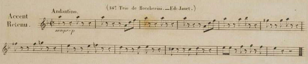 The 3- appears to be a bit confusing. Baillot, who explicitly quotes this definition, interprets it as the possibility of underlining a note that is in a different register from the others, by detaching it from the others.40 Eugène Walckiers, in his Méthode de Flüte (1829), defines the musical accent almost identically to Castil-Blaze and for this third manner only writes "3-by detaching it from the others."41 Therefore, it seems to be a matter of using articulations.