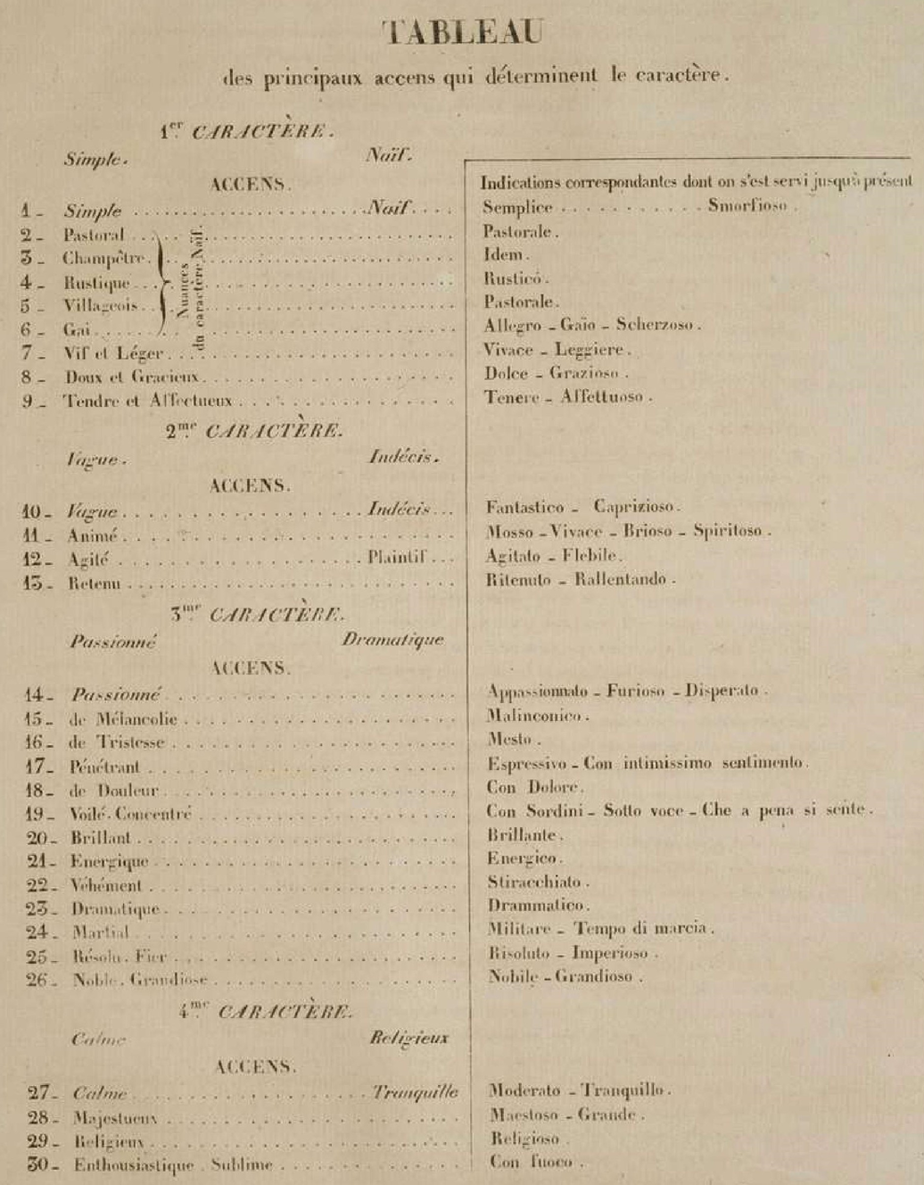 In order to illustrate this concept, Baillot proposes a table that lists the different possible accents for four main characters, related to the different ages of human life: the simple and naive character, the vague and indecisive character, the passionate and dramatic character, and the calm and religious character.47 This table also presents the indications often used by the composer to make the performer understand the Accent to be expressed.48 (example 1)