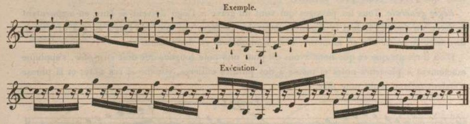 According to Lefèvre, this articulation is done with "less force" with a "lighter" Tongue stroke.15For Berr, each note should have its full value.16
