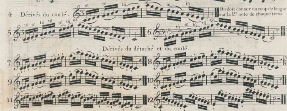 Several ways to detach the notes are discussed. They are indicated by different signs and are commonly described through the characterization of the Tongue stroke. Walckiers, in his Méthode de Flûte (c.1829) summarizes its different nuances as follows:
