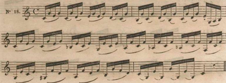 Frédéric Berr integrates in his treatise a consequent number of exercises on different slurred/detached patterns. The different options are mainly the same as the one presented by Lefèvre. In example 10, he shows how articulation can allow to underline the most important notes which, in a way, form a melody.