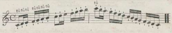 This articulation, written with an elongated dot (example 2), is the driest Tongue stroke. This idea appears for example in the Méthode de Flûte by Hugot and Wünderlich (1804).5Lefèvre describes it as "strong and vigorous,"6while Ozi, in his Nouvelle Méthode de Basson (1803) uses the word "firm".7