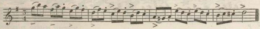 The same general recommendation can be found in Garaudé's method. Nevertheless, he adds a little nuance to this rule, suggesting a difference in execution according to tempo and thus character. A slight inflection is sufficient in a slow movement, whereas in a faster tempo this inflection should be more marked. This is particularly the case for syncopations which are a characteristic element of the piece, for example the Polonaise.45