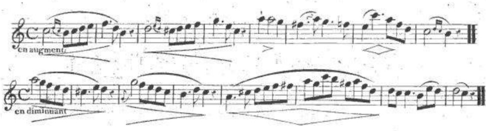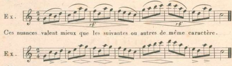 Therefore, the play of dynamics can be summarized in these main ideas: play more or less loudly, increase or decrease the sound. In the Méthode de violon (1803), first violin method of the conservatory, Baillot, Rode and Kreutzer give details about these different possibilities. These principles can be applied to a single note, to several, or even to a whole phrase.2These same principles are retained in Baillot's second method,3 L'Art du Violon (1834). Garaudé, in his Méthode complète de chant (c.1825), refers to these different principles by speaking of "various effects or inflections, to which a sustained sound or a musical phrase may be susceptible.”4 Frédéric Berr also details them in his Traité describing different ways of conducting the sound.5