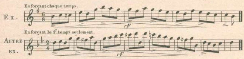 According to Garaudé, it is mainly found on the tonic accent of words, as well as on the strong beats and appoggiatura.11His explanations about syncopated notes and sons coupés (shortened sounds) suggest that he uses the same dynamic on these specific accents. Frédéric Berr, apart from the tonic accent linked to the text which does not concern instrumental music, also speaks of these elements and adds triplets, leading tones, accidentals and notes jetées.12