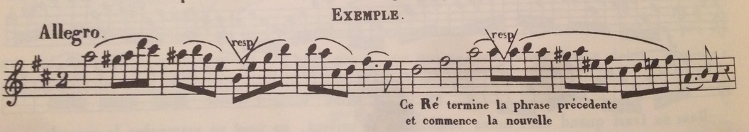 Finally, Walckiers discusses the case where the final note of a phrase is also the first of the next one.23In the following example, this is the issue for the D of the fifth bar. The breathing should be taken earlier or later.(example 10)