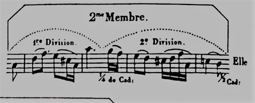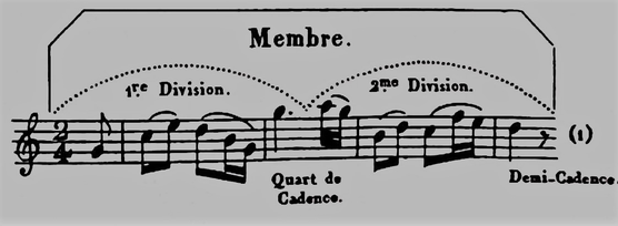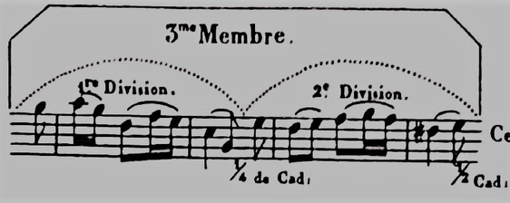 The notion of Period does not appear in Rousseau's writings or in the methods of the early 19th century. On the other hand, it is defined by Castil-Blaze, in the Dictionnaire de musique moderne (1825) as a "musical phrase composed of several members whose union forms a complete meaning."10 Walckiers gives a similar definition.11