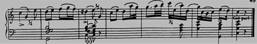 The Period is concluded with a strong Repos, which "leaves nothing to be desired”. It is indicated by the perfect cadence, compared to the full stop (.) of the spoken speech.12 The example 4 presents a complete Period.