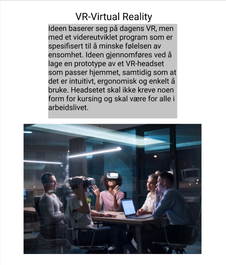 Konseptet omhandler ensomhet knyttet til hjemmekontor. I dagens situasjon blir det mer og mer vanlig å ha hjemmekontor for å unngå minske fysisk kontakt på jobb. Dette fører til at mange blir isolert, ettersom sosialisering handler om å leve sammen med andre mennesker i felleskap. For en del mennesker er jobben det eneste stedet de har mulighet til å sosialisere seg. Det skaper dermed et problem når man ikke kan møte opp fysisk på jobb, og arbeidet forløper hjemme. Konseptet skal derfor prøve å gjenskape denne sosiale tilstedeværelsen selv om man ikke er på jobb. Løsningen baserer seg på VR (Virtual Realty)