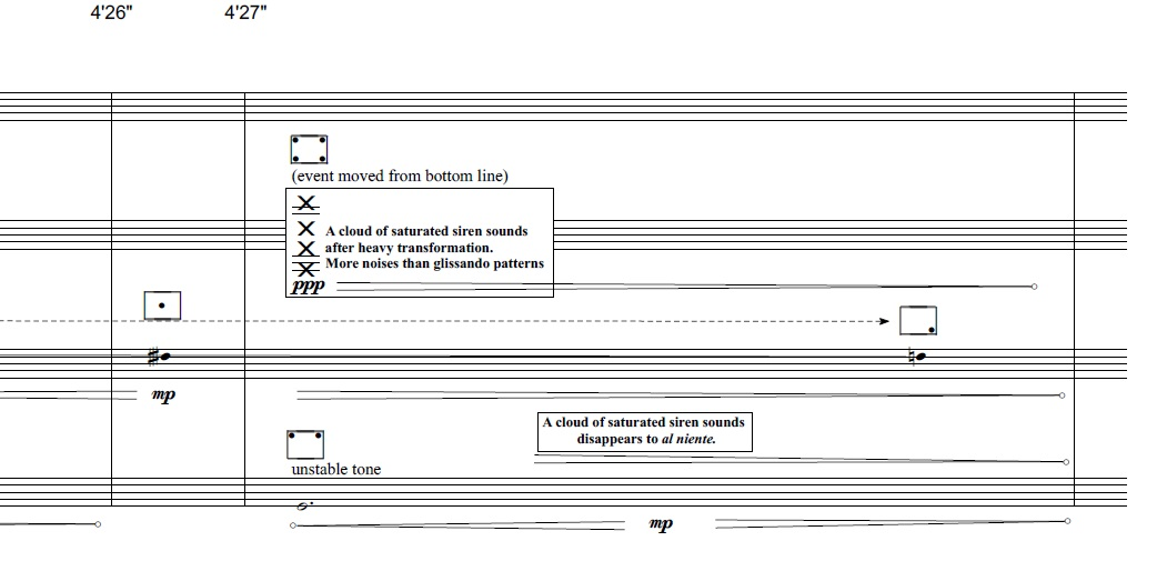 Początkowa faza utworu oparta jest na kolistym ruchu dźwięku syreny w przestrzeni akustycznej. Jednocześnie dźwięk syreny wykonywany przez perkusistkę stanowi wyselekcjonowane punktowe źródło dźwięku i zakrzywia ekspozycję tego materiału, przełamując perspektywę postrzegania ruchu glissanda jako jednowarstwowego i jednokierunkowego zjawiska. Kulminacyjny moment tego gestu pojawia się w takcie 43 utworu. Przy osiągnięciu swojej najwyższej wysokości syrena akustyczna przecina pochód dźwiękowy wprowadzonych w odstępach ćwierćnutowych pięciu fal syreny w warstwie elektronicznej, wykonujących ruch glissando w górę. Po drugim powtórzeniu tej figury i wejściu w takcie 55 szorstkiego akordu analogowego, syrena akustyczna stopniowo zanika. Dźwięk syreny w swoim „oczywistym” kształcie już ponownie nie pojawi się wprost w kompozycji.