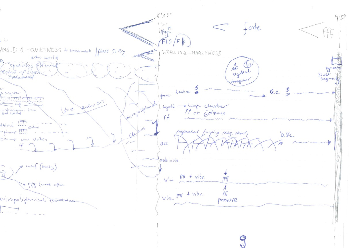 Faza wstępna, przytłaczająca masa dosadnie wyjących glissand syren wykonywanych zarówno przez perkusję, jak i widocznych w warstwie elektroakustycznej, jest wypełniona składnikami z widm tonów podstawowych A, E i H, nieustannie modulujących między sobą. Ta masa tworzy tzw. ścianę barwową, tak często wykorzystywaną przez kompozytorów takich jak Tristan Murail czy Gerard Grisey, do stworzenia określonej ekspozycji materiału harmonicznego dla słuchacza. Nie zamierzałam jednak utrzymywać stabilności z początkiem utworu „Isorropía […]”, ale wolałam wykorzystać wstępną ścianę barwową jako pobłyskujące płótno dla całkiem abstrakcyjnie rozwijających się modulacji dźwiękowych. Szybki ruch, rytmiczny niepokój, preferencja w tworzeniu klasterów dźwiękowych w wysokim rejestrze pomiędzy instrumentami tworzą wspaniałe uzupełnienie do agresywnego analogowego akordu w warstwie elektronicznej i otaczających go zewsząd glissand syren.