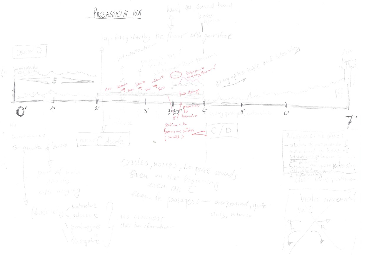 Poszukiwanie odchyleń mikrotonalnych w Passaggio III: Phantom skupia się na trzech głównych komórkach materiałowych. Mikrotonalność jest w tym utworze traktowana swobodnie i przeprowadzana bez wcześniejszej analizy dźwięku; ma na celu wyostrzenie brzmień i radykalizację harmonicznej zawartości materiału muzycznego. Analizowałam także możliwości wykorzystania mikrotonu jako małej cząsteczki nieustannie zmieniającej się w progresji nachodzących po sobie dźwięków, niezbyt stabilnej, ale widocznej jednostki w procesie przelewania się ciągu nut. To spowodowało, że partytura kompozycji została zaprezentowana poprzez zapisywanie indywidualnych zjawisk dźwiękowych na każdej oddzielnej pięciolinii dla każdej pojedynczej struny instrumentu. Zaletą tego zabiegu jest możliwość precyzyjnego kontrolowania ruchów smyczka po strunach i płynnej kontroli pochodów lewej ręki na gryfie instrumentu. Ten sposób notacji pozwala również bardzo dokładnie i przejrzyście zapisać wskazówki wykonawcze, które należy zinterpretować na każdej ze strun, zwłaszcza dwudźwięki łamane przez interakcje różnych strun, z wkomponowanymi dominującymi melodiami zaszyfrowanymi na poszczególnych pozycjach.