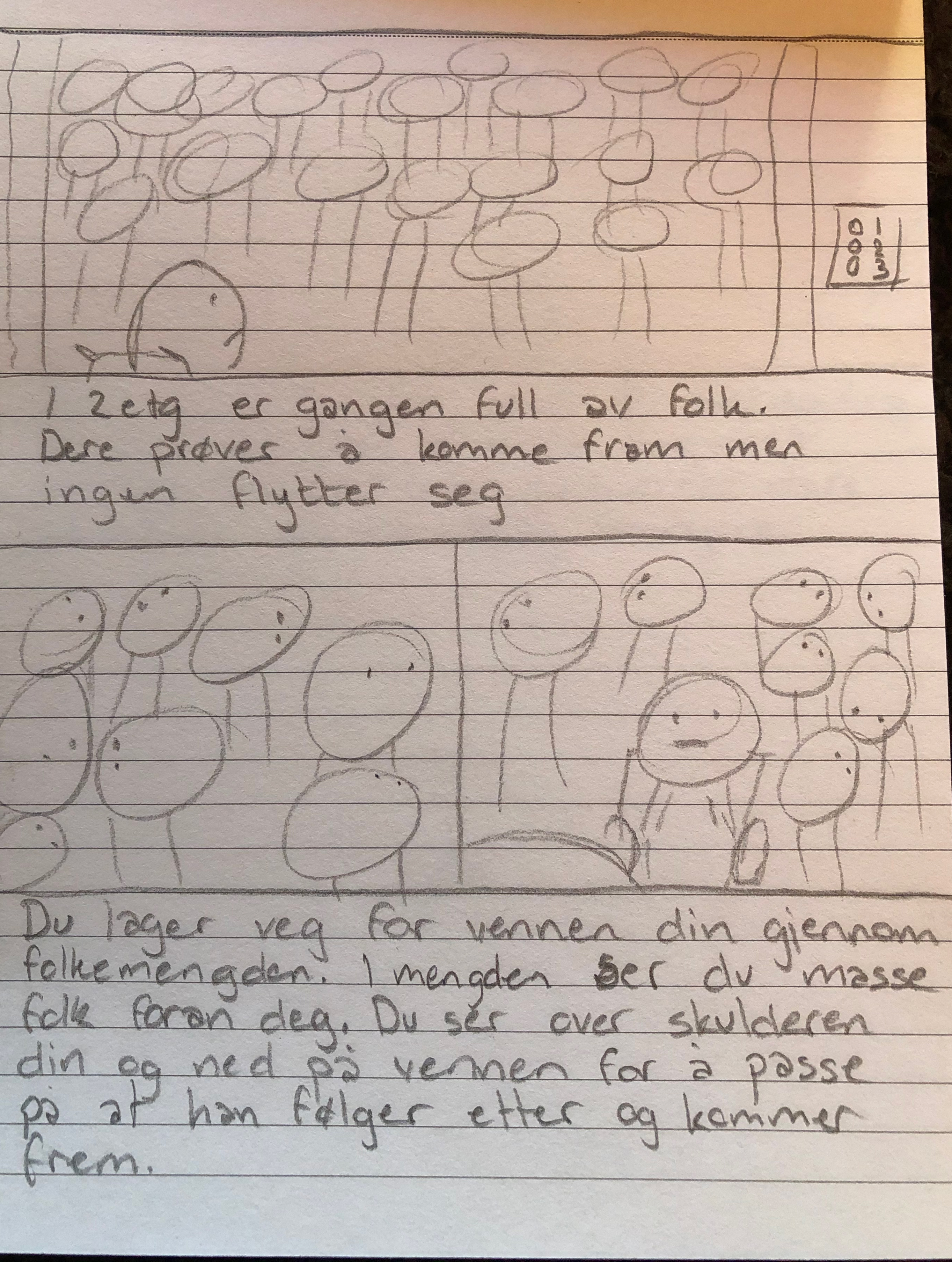 Da vi kommer opp i 2. etg ser du ut i gangen at det er fult av folk. Ingen flytter seg for dere, så du må gå foran for å lage vei. Ute i folkemengden ser du framover på alle menneskene, før du deretter ser over skuldere og ned på vennen i rullestol.