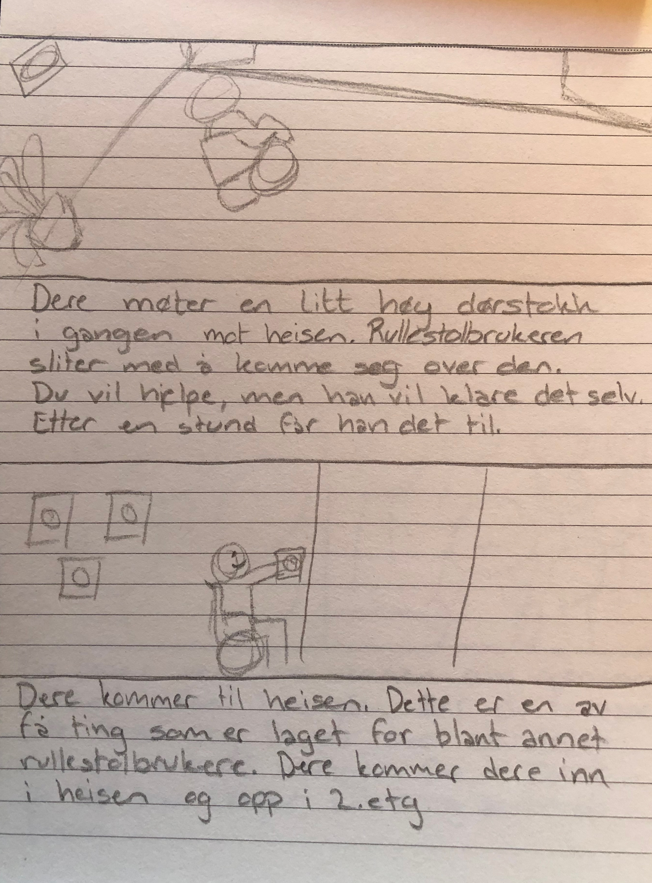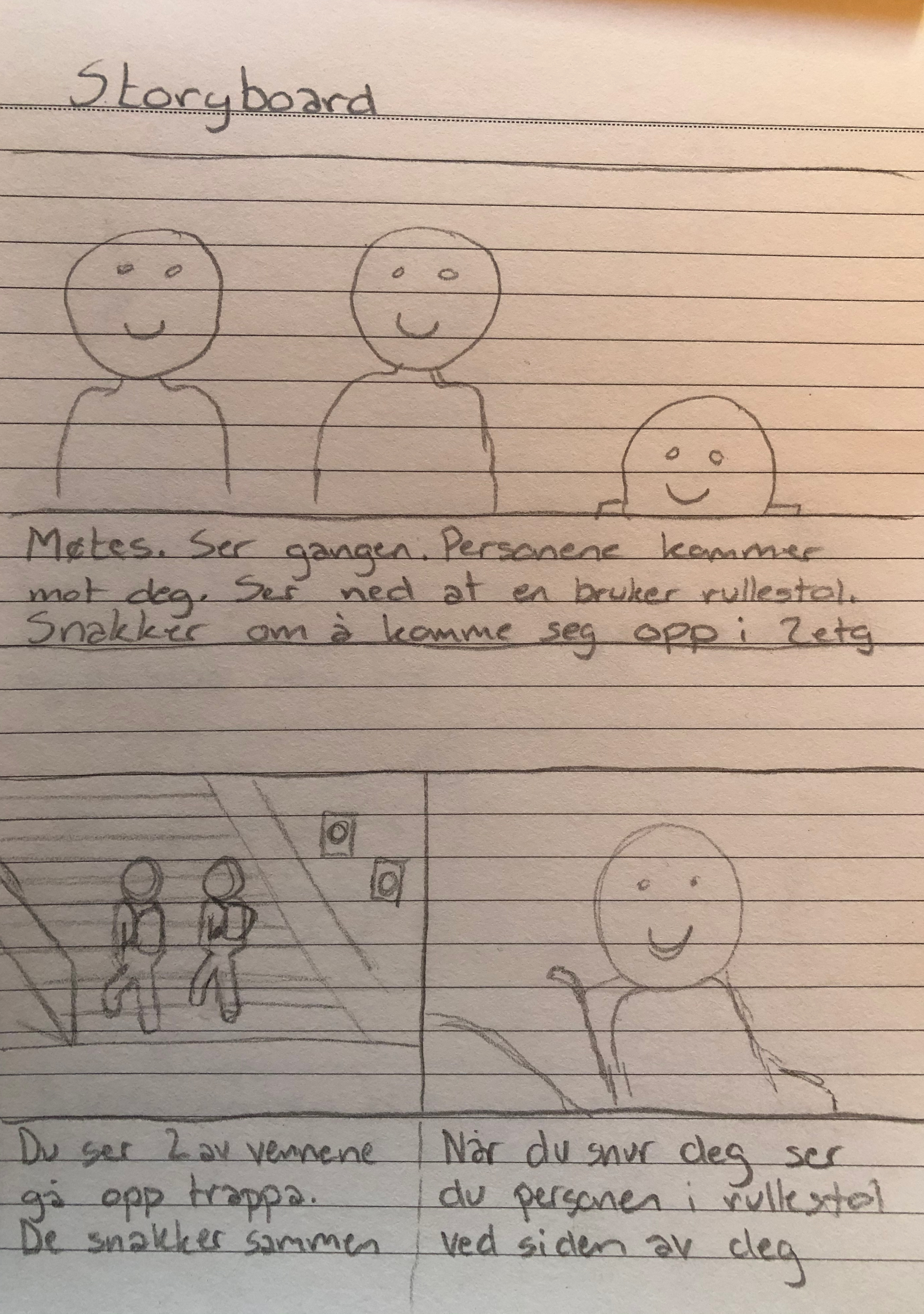 Fire studenter møtes i gangen på skolen. De skal opp i 2. etg for å delta i forelesning. En av studentene er rullestolbruker og må finne en alternativ vei opp. Du er den ene studenten og vil følge rullestolbrukeren for å holde han med selskap.