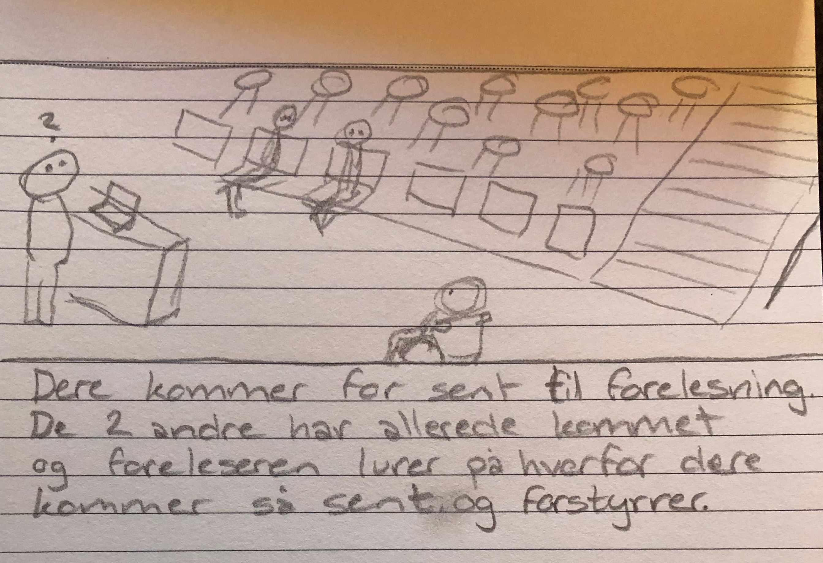 Dere ankommer sent til forelesningen og forstyrrer foreleseren. Dette er en konsekvens av dårlig tilrettelagt framkomst på skole. Du ser rundt i auditoriet, påforeleseren som er misfornøyd på grunn av avbrytelse, og på de to vennene som allerede har ankommet auditoriet.
