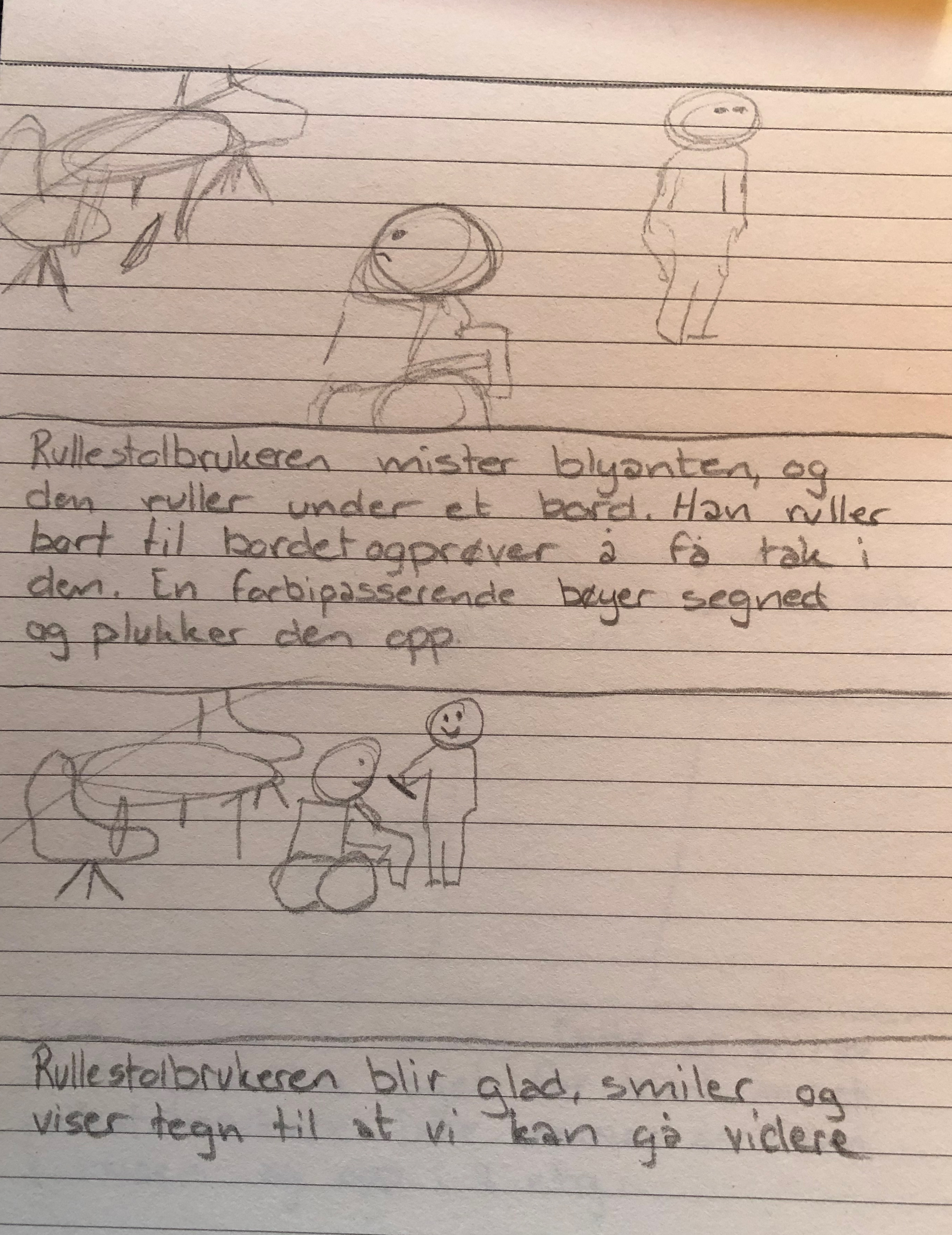 Første hindring rullestolbrukeren kommer over er bord og stoler plassert i gangen. Han mister en blyant som triller under disse møblene så han ikke får tak i den. En forbipasserende plukker opp blyanten og gir den til rullestolbrukeren.