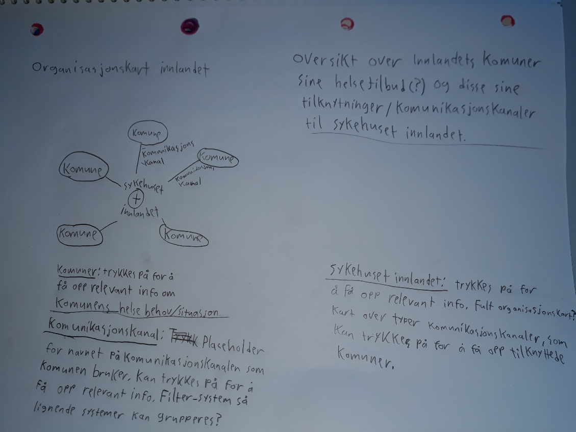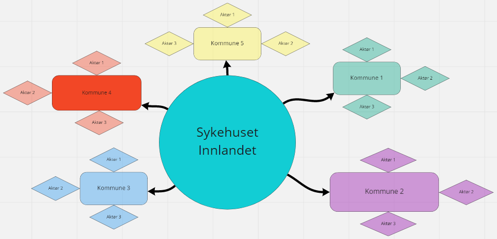 Vi begynte med å snakke med medlemmer av HelseInn for finne ut hva de trengte i sin løsning. De fortalte at de trengte en oversikt over kompetanseforaer i Innlandet som er knyttet opp mot sykehuset Innlandet. Vi bestemte oss for å lage et organisasjonskart over disse ulike aktørene og hvordan de er knyttet opp mot sykehuset. Vi bestemte oss for å ikke sette det i en geografisk kontekst da den interessante informasjonen er organisasjonens struktur heller enn hvor ulike aktører holder til.
