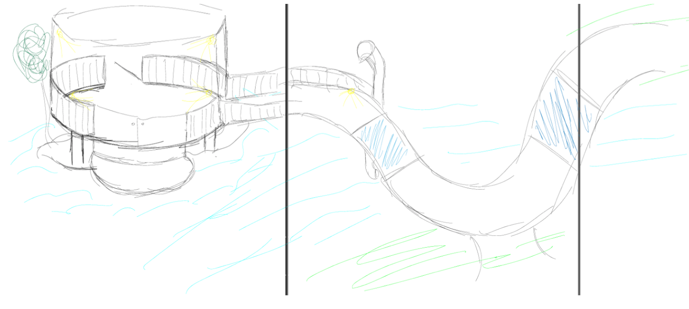 En type platå som står opp fra den naturlige øya som har forekommet i naturen påbegrunnet elvestrømmninger. Denne skal være et slags tilholdssted med sitteplasser. Det skal være bru mellom plassen og inn på området ved lekestativ/volleyballbane. Denne brua skal være utsyrt med glass plater som gjør at men ser ned i elven samt en type kikkert som gjør at man kan se under vannoverfalten. Platået skal ha gelender som hindrer folk fra å dette utenfor men det skal være åpen løsning med et enkelt tak. slik at man får ly på høst og vår dager.