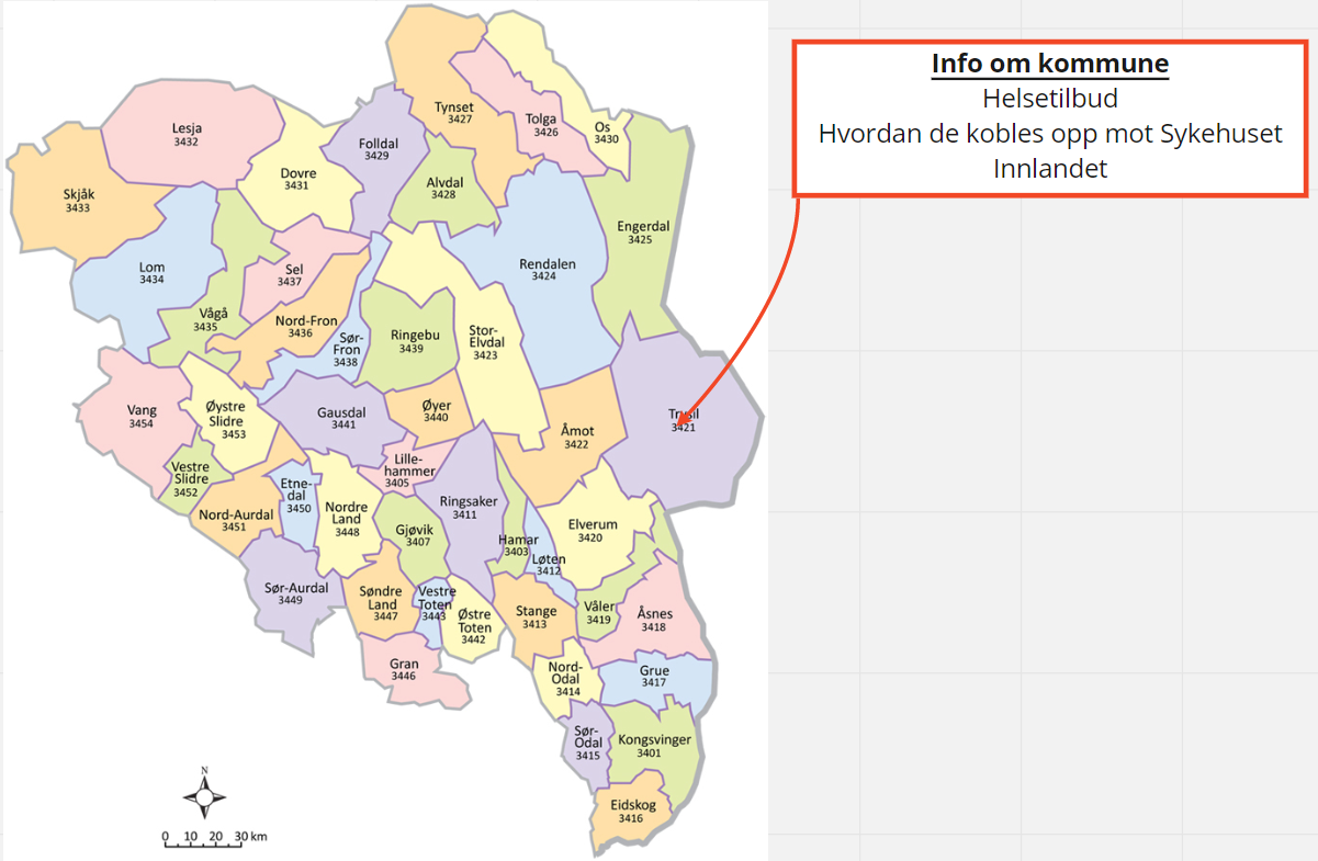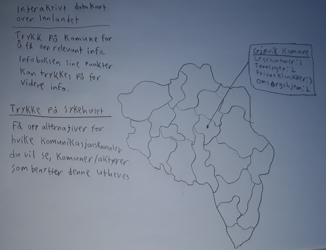 Trykk på fylke, zoome inn og se kommuner i fylket. Trykk på kommune, få opp boks med info. Få opp kommunikasjonskanaler for kommunen.