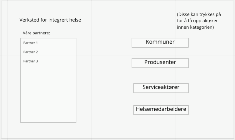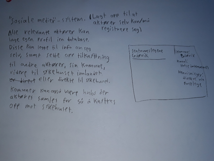 Vi begynte med å snakke med medlemmer av HelseInn for finne ut hva de trengte i sin løsning. De fortalte at de trengte en oversikt over kompetanseforaer i Innlandet som er knyttet opp mot sykehuset Innlandet. Vi bestemte oss for å lage et organisasjonskart over disse ulike aktørene og hvordan de er knyttet opp mot sykehuset. Da det er mye informasjon å hente inn for oss direkte så vi for oss en løsning der aktører selv kan laste opp sin informasjon som er relevant. Det virket hensiktsmessig at aktørene kunne kommunisere med hverandre direkte, samt oppsøke andre aktører for å planlegge samrabeid. Derfor så vi for oss et system som er inspirert av sosiale medier.