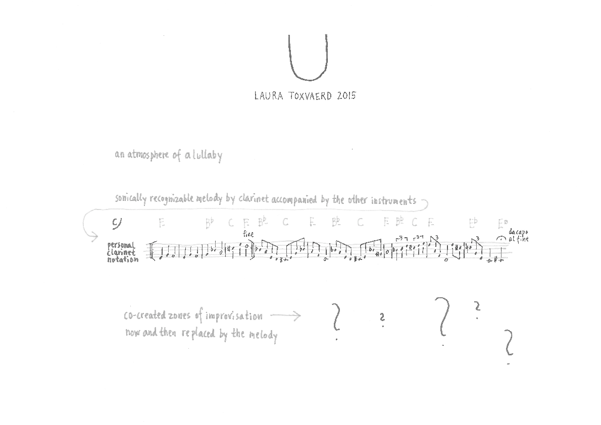 When I composed U I wanted to create an atmosphere of a lullaby. Zones of improvisations would now and then be replaced by a sonically recognizable melody played in the low register of the clarinet, accompanied by the pianist and the bassist – visiting the indicated harmonies – and the drummer. The improvising musicians were being called upon to co-determine which instruments were going to play in the different zones of improvisation.