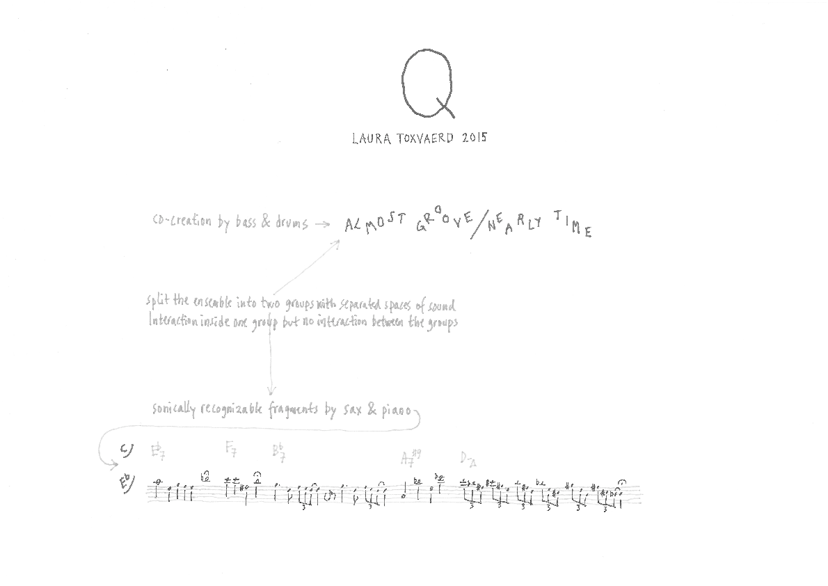 When I composed Q my plan was that the co-creation by the bass and the drums would be manifested as an improvised “almost groove/nearly time”, while the alto saxophone and the piano would play sonically recognizable fragments in the form of a rubato-articulated melody with accompanying chords. In this way, the composition would come to have a sonic character that one would recognize after hearing it only once. In addition, there would be the clear manifestation of an element of the improvising musicians’ co-creation of the composition.