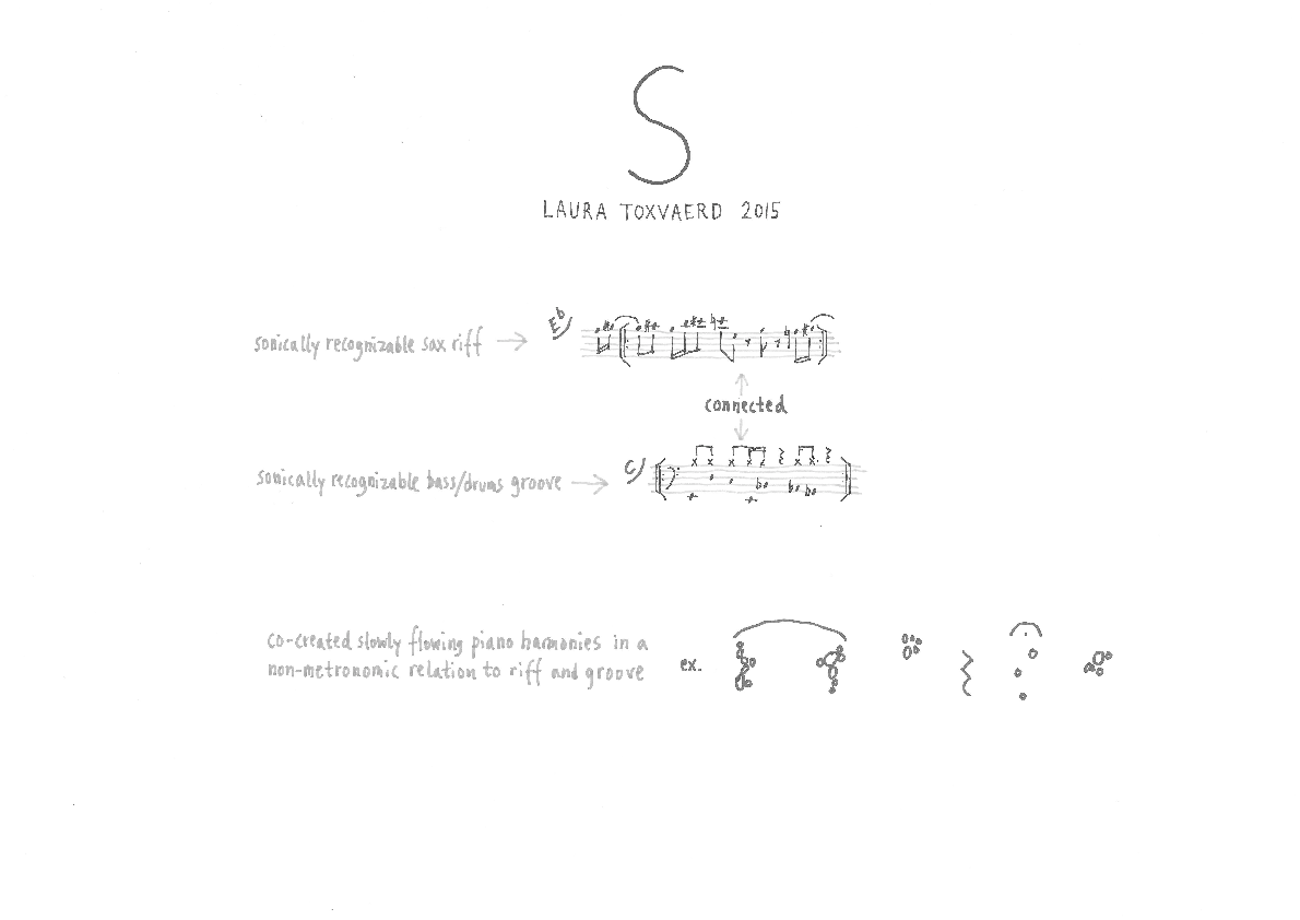 When I composed S, I thought that I would have some sonically recognizable elements in the various forms of a metronomic groove, played by bass and drums, and a saxophone riff that was connected to that pulse. By the term “riff”, I mean to indicate a short and catchy melody line. This line should be repeated multiple times and each repetition should have the length of five beats.