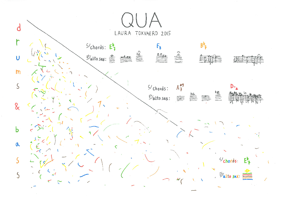 After the rehearsal and the concert performance of Q, I realized that bass and drums had replaced the “almost groove/nearly time” with a different rhythmic layer. A groove needs to have a rhythmic coordination among some of the instruments but the musicians’ co-created improvisation had moved them away from this coordination. Because it did work well in relation to separating the music into two spaces of sound, I chose to integrate the bassist’s and the drummer’s conception of this different rhythmic layer into the composition, QUA.