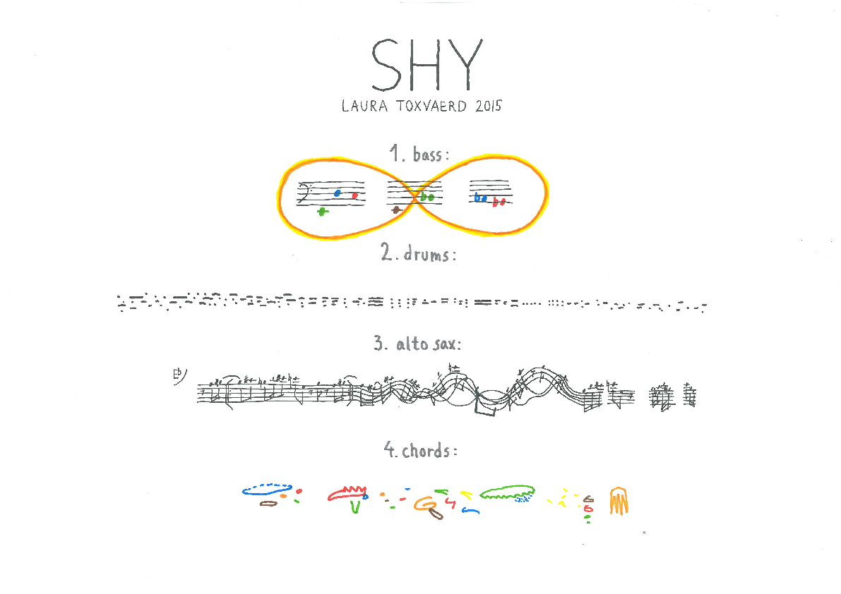 However, at the rehearsal, and the concert, the roles changed: all the musicians now played alternately with and without any metronomic pulse underlying their play. The alto saxophonist was still being a bit enervating and insistent, while the pianist maintained a relaxed and cheerful distance to this pushiness. Because this co-creation worked so well, and because it matched what I wanted, I integrated this co-creation into the composition of SHY. The alto saxophone riff and the bass line were still recognizable, but now they were laid open to possible mutations.