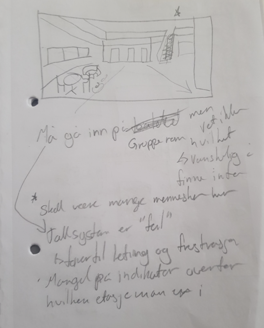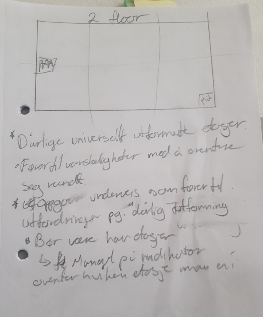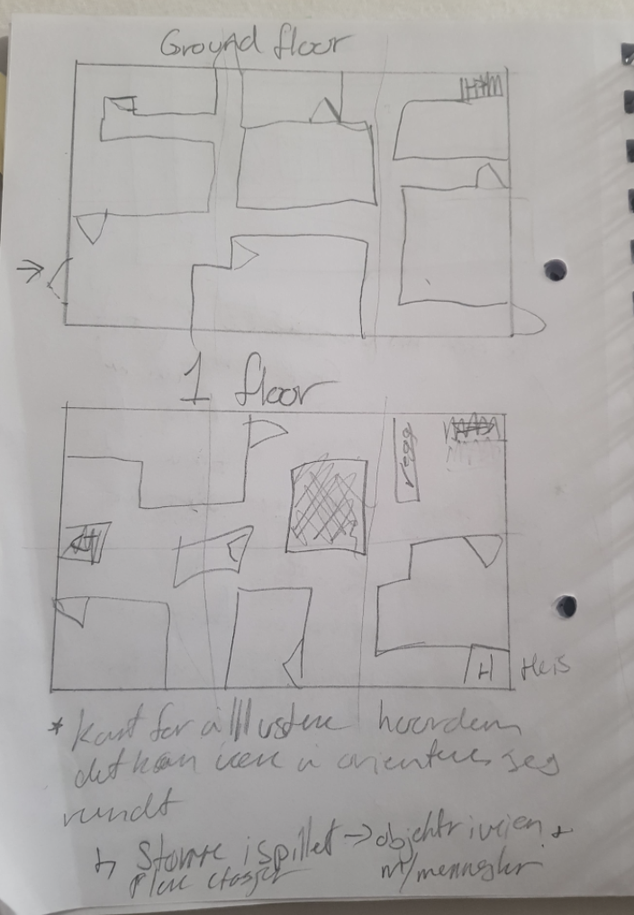 Dårlig universelt utformet etasje. Fører til vanskeligheter med å orientere seg rundt. Spillet spilles I 1. perspektiv og kartene vil ikke være synlig. Oppgaver vil komme undervise som fører til utfordringer på grunn av dårlig utforming. Det vil være mangler på indikatorer i forhold til hvor man er i bygget.