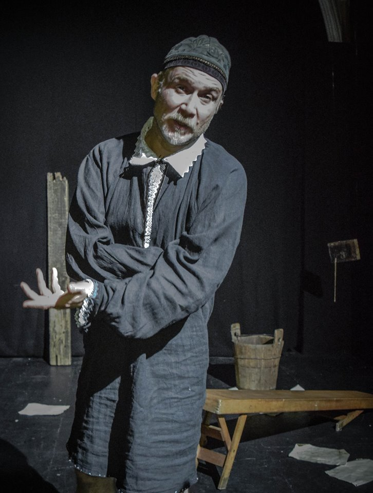 The lighting was based on the effects and muted colours. Later (than the time of the play) Dutch masters, the few authenticated (and disputed) potraits of Shakespeare, and the later self portraits of Rembrant provided materials to influence the look of the character.