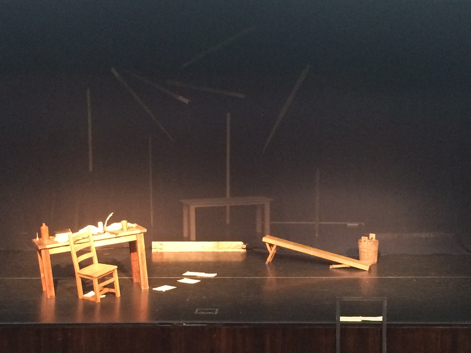 A broken suspended frame of a house and crooked askew furniture, to reflect the fragilty of theatre, the insubstanitiality of memory, a disrupted household and of a life spent building for the future. The design by director Lucyna Rossa was influenced by Cornelia Parker's exploded shed, 'Cold Dark Matter', reflecting the repeated imagery of shipwreck and decay that pervades the text.