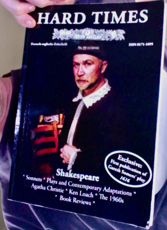 Shakespeare is alive! This is least the impression every audience member gets who sees Gareth Somers as Shakespeare on stage in his play 1616. Somers' exciting performance cannot be done justice in words. But this issue’s cover photo might give you an idea of how powerfully he brings the bard alive. Moreover, he generously allows us to be the first to publish his poetic play text and thus to continue Hard Times's tradition to publish creative work. Somers beautifully combines the materiality of Shakespeare’s world and family situation with close readings of his works. By re-stealing heavily from Shakespeare’s works Somers unpicks Shakespeare as a national icon and illustrates the bard’s own plagiaristic way of working. At the same time he reestablishes him as a leading cultural figure and his works as fountains for artistic inspiration and playful adaption.